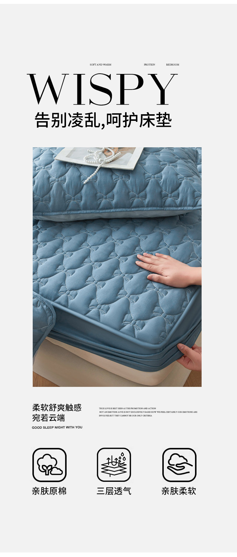 LIFE.丽芙 2025新款水洗原棉单件蝴蝶结绗缝夹棉床笠三件套 蝴蝶结床笠-宾利蓝