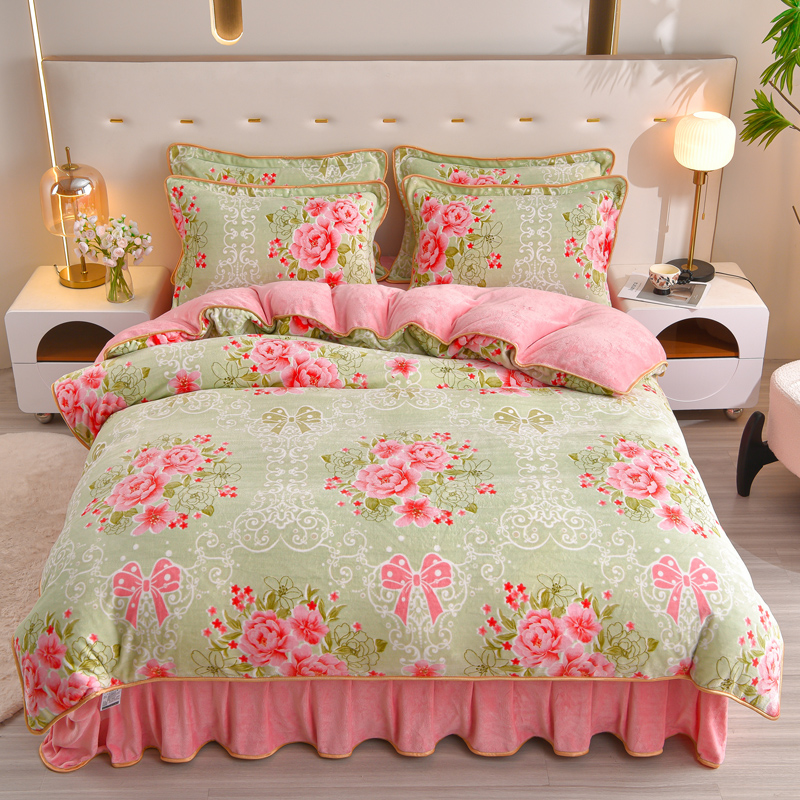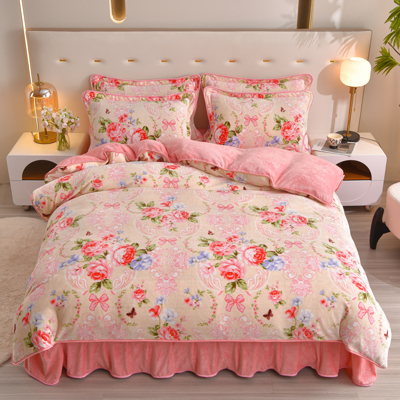 仟岸家纺 2025新款高克重床裙款印花牛奶绒四件套 玫瑰情缘