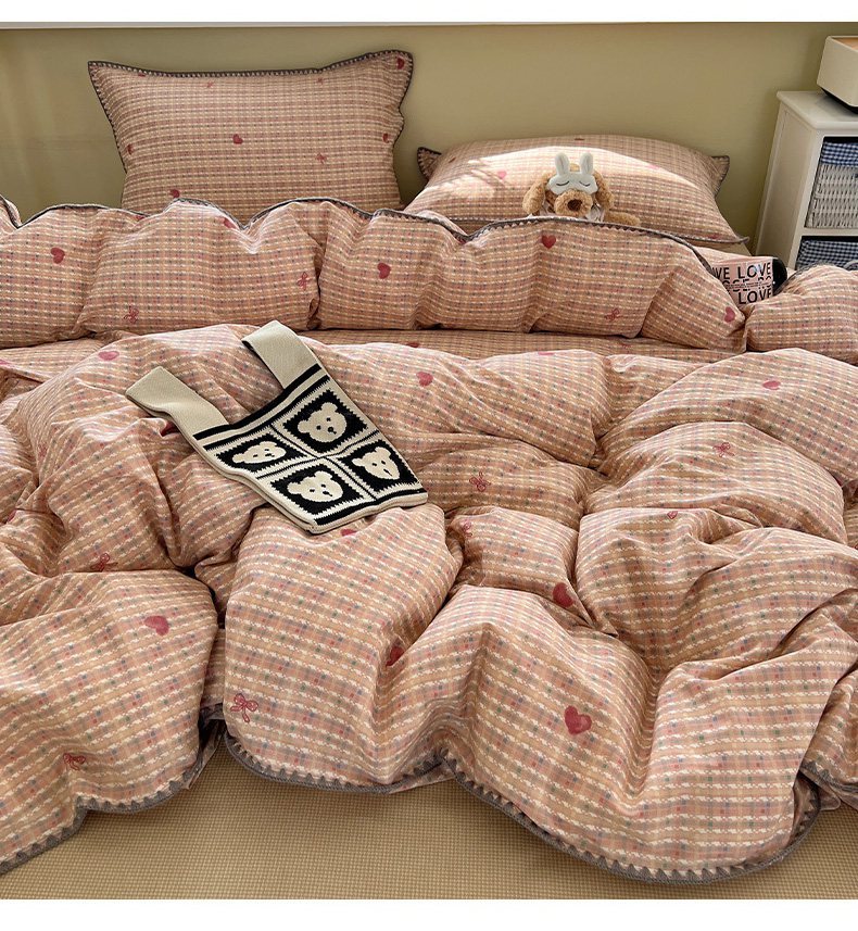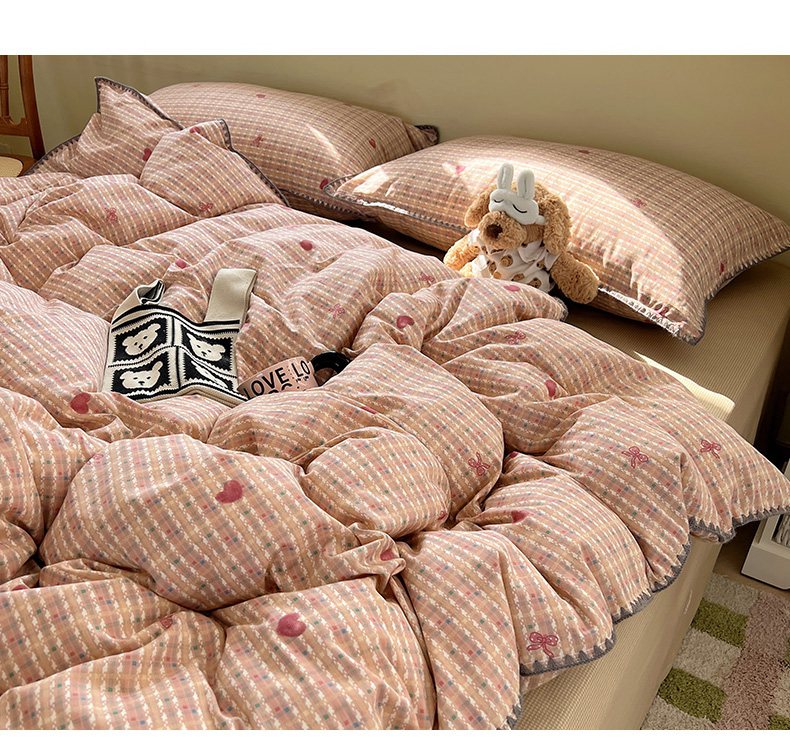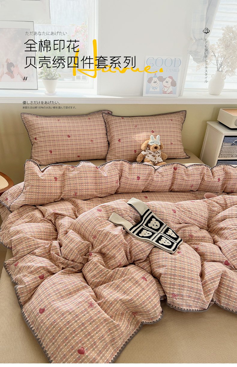 瑞莱 2026新款全棉印花贝壳边四件套 爱心结