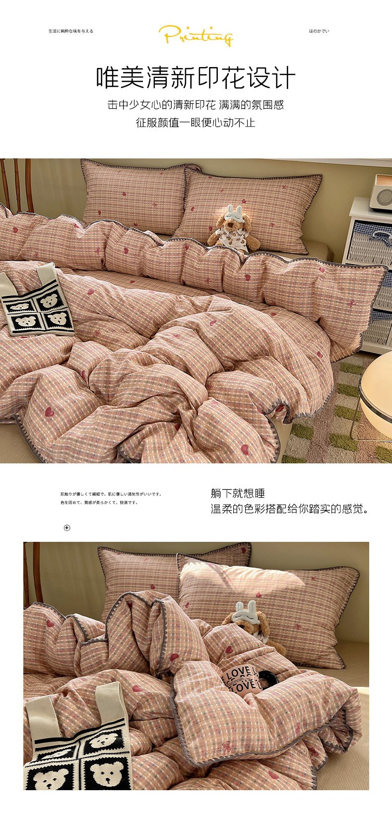 商品名称:瑞莱 2026新款全棉印花贝壳边四件套 爱心结