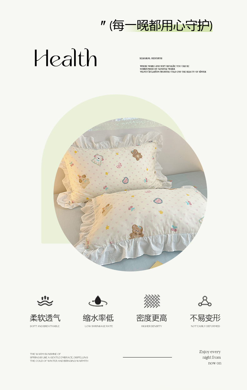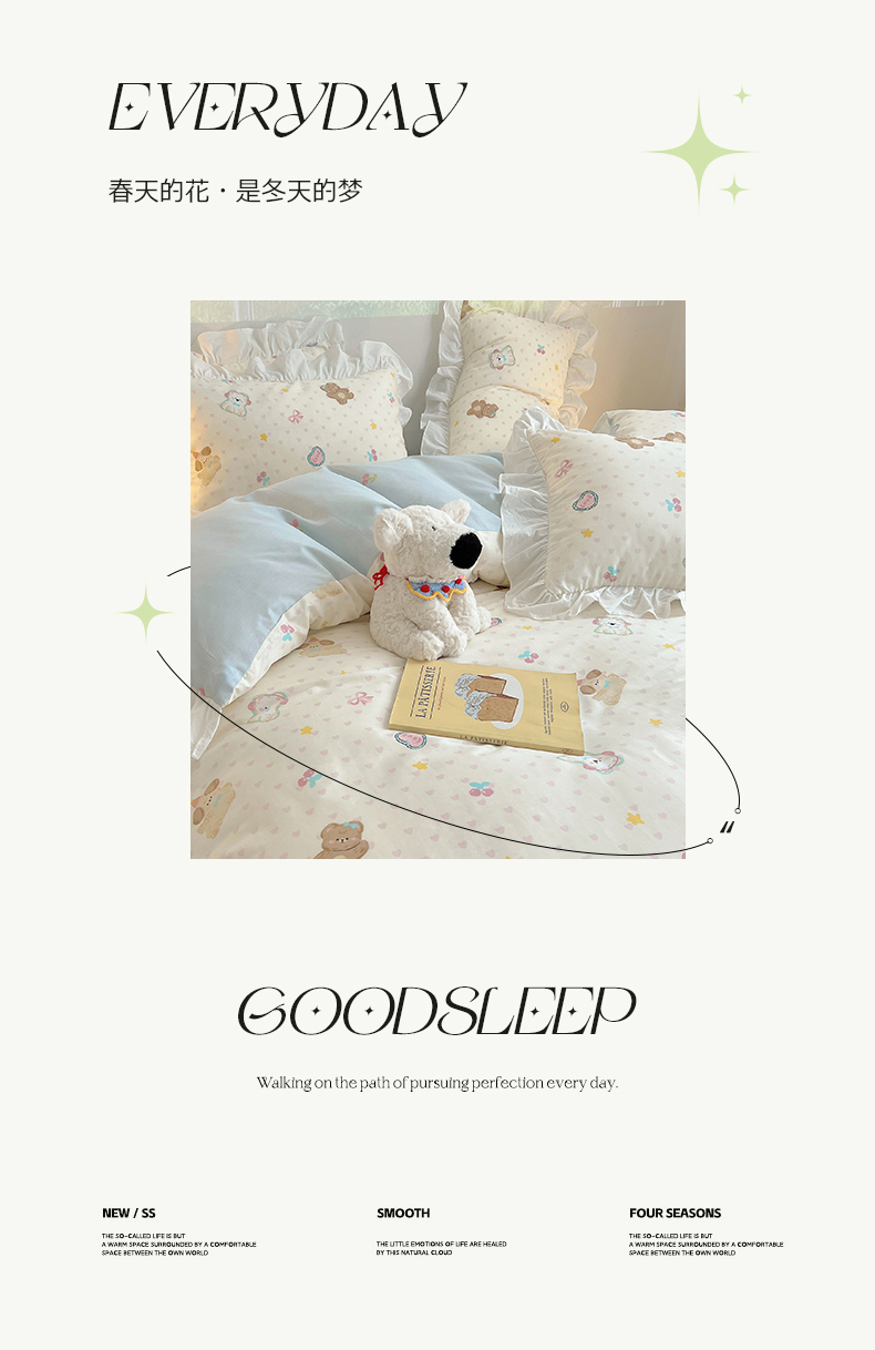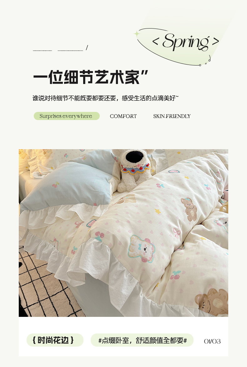 商品名称:六巷胡同 2026春夏新款韩式INS减龄花边款全棉卡通四件套 花边奶油甜心熊