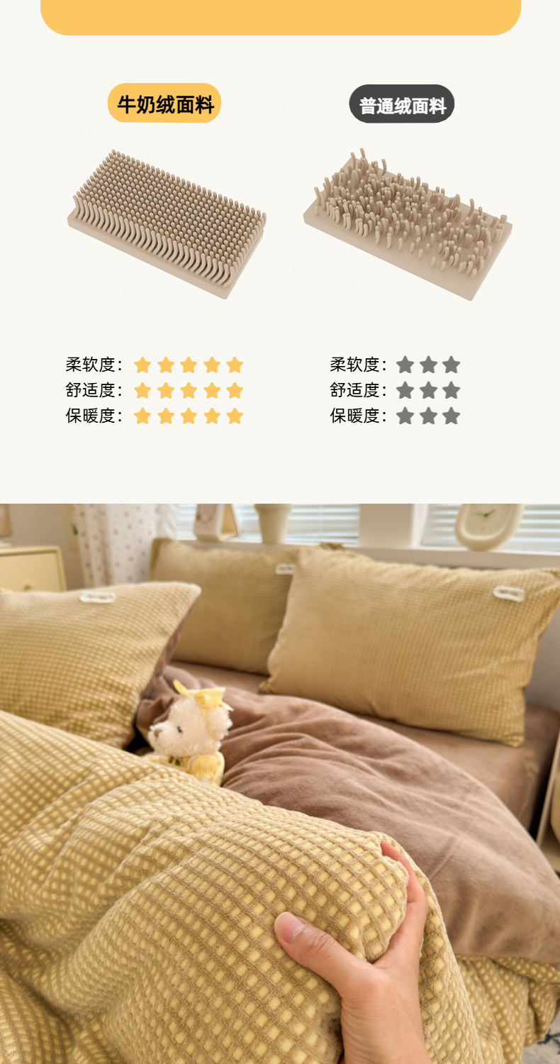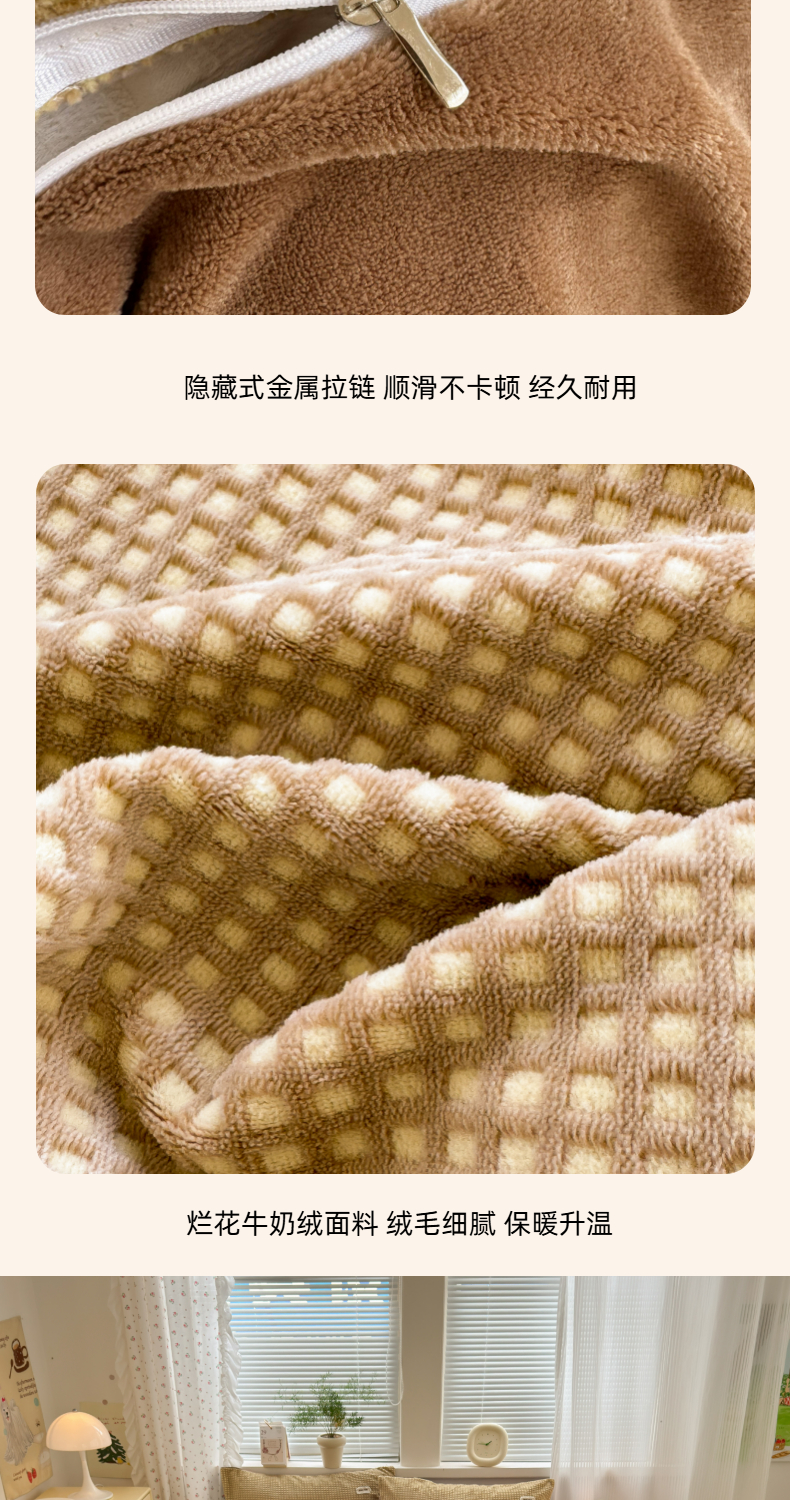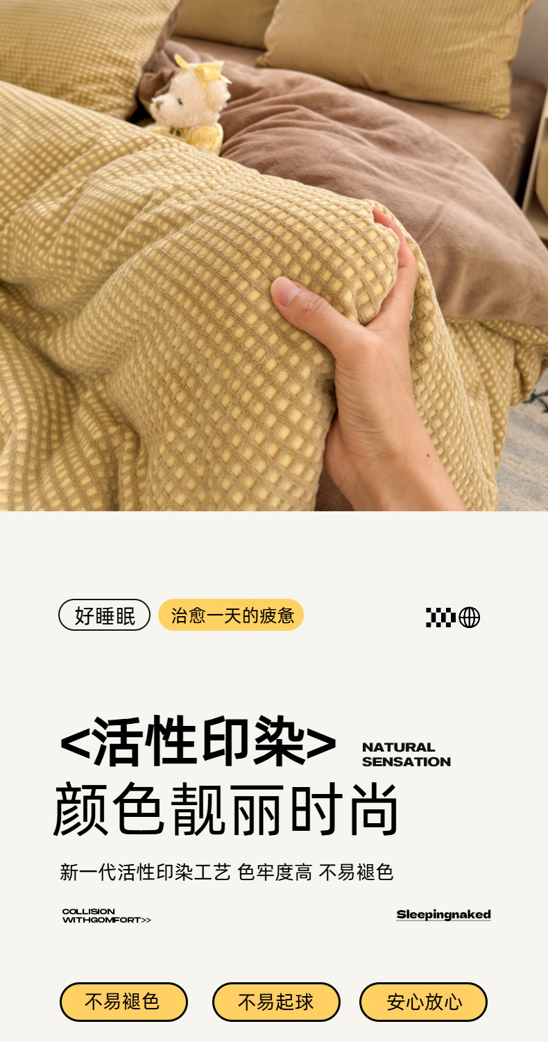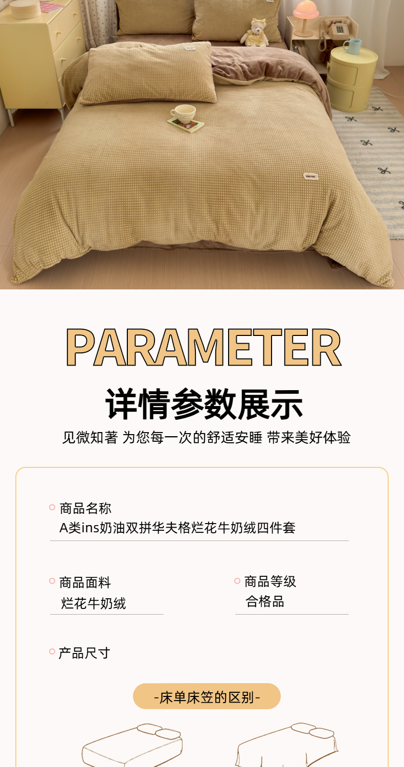 商品名称:欣宜家纺 2025秋冬新款ins奶油风双拼华夫格烂花雕花绒牛奶绒四件套 华夫格-奶咖