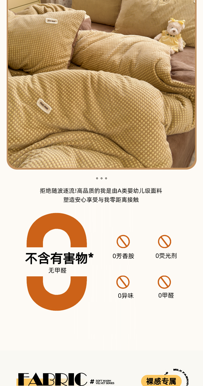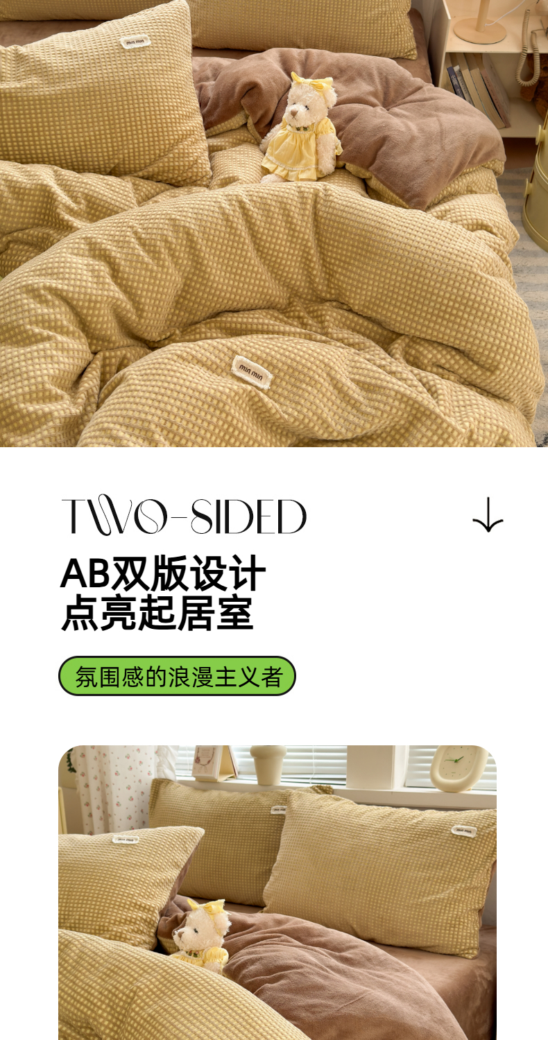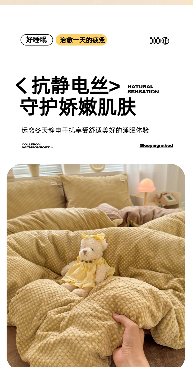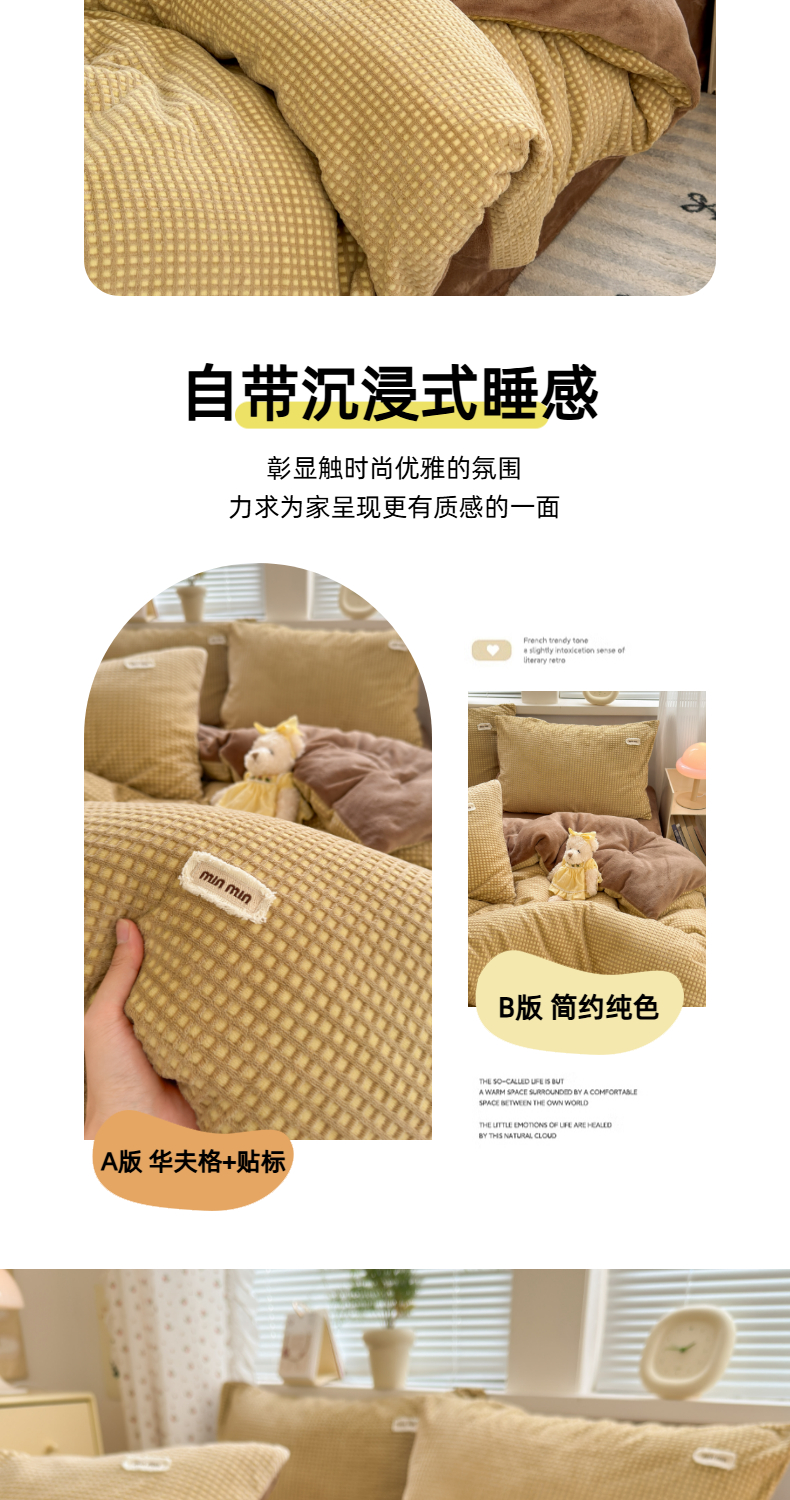 商品名称:欣宜家纺 2025秋冬新款ins奶油风双拼华夫格烂花雕花绒牛奶绒四件套 华夫格-奶咖