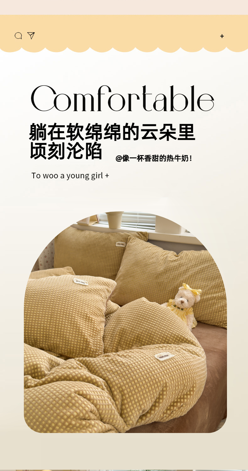 欣宜家纺 2025秋冬新款ins奶油风双拼华夫格烂花雕花绒牛奶绒四件套 华夫格-奶咖