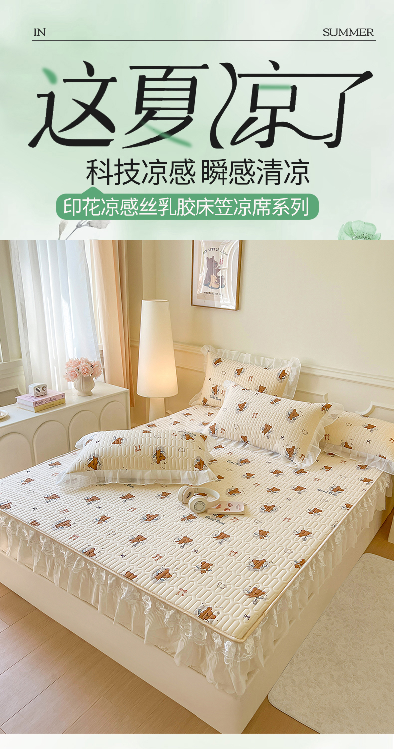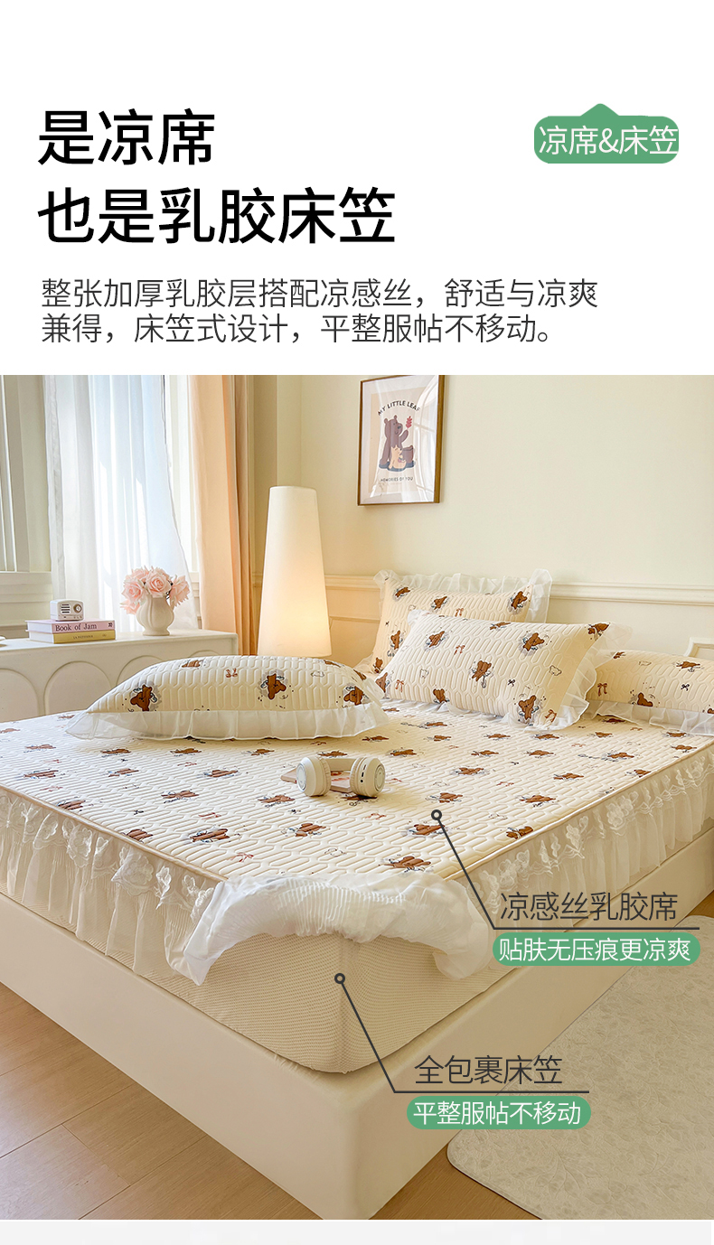 网红馆(ck家纺) 2026新款凉感丝床笠式床裙款乳胶乳印花凉席 嘟嘟熊 茶