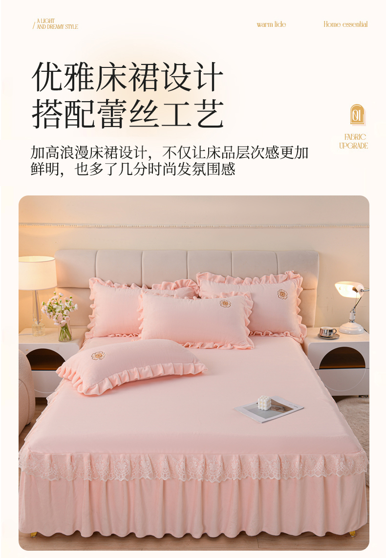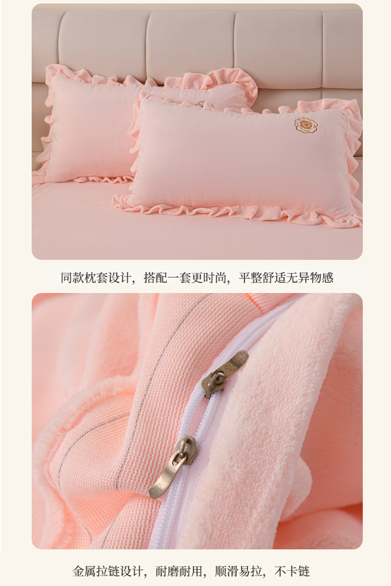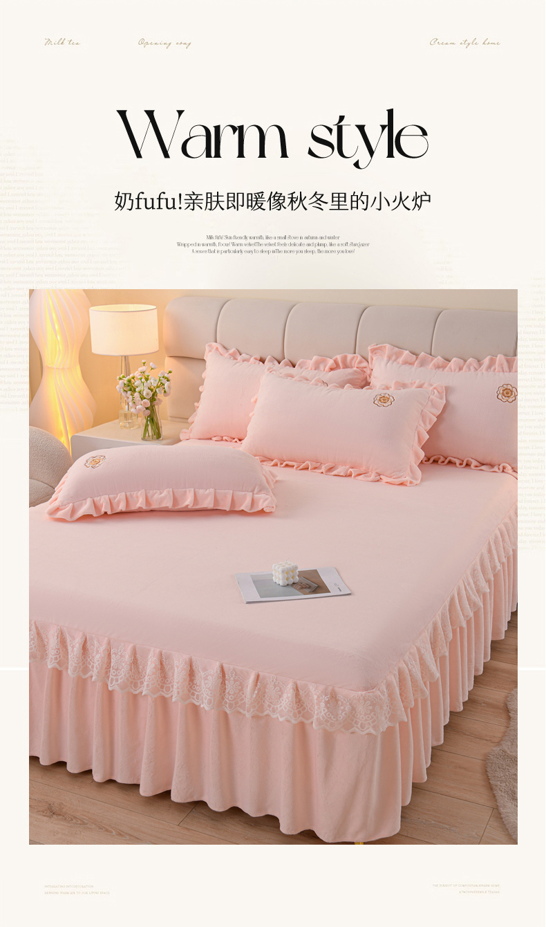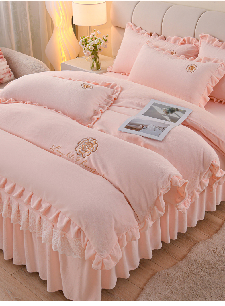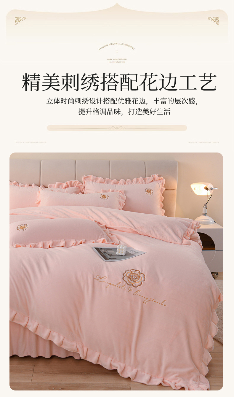 当前位置: 91家纺网 > 商品网购 > 床品套件 > 四件套 > 牛奶绒四件套 > 优家居工厂店 2026新款240克高克重牛奶绒韩版刺绣花牛奶绒床裙四件套床裙三件套 安娜-浅粉