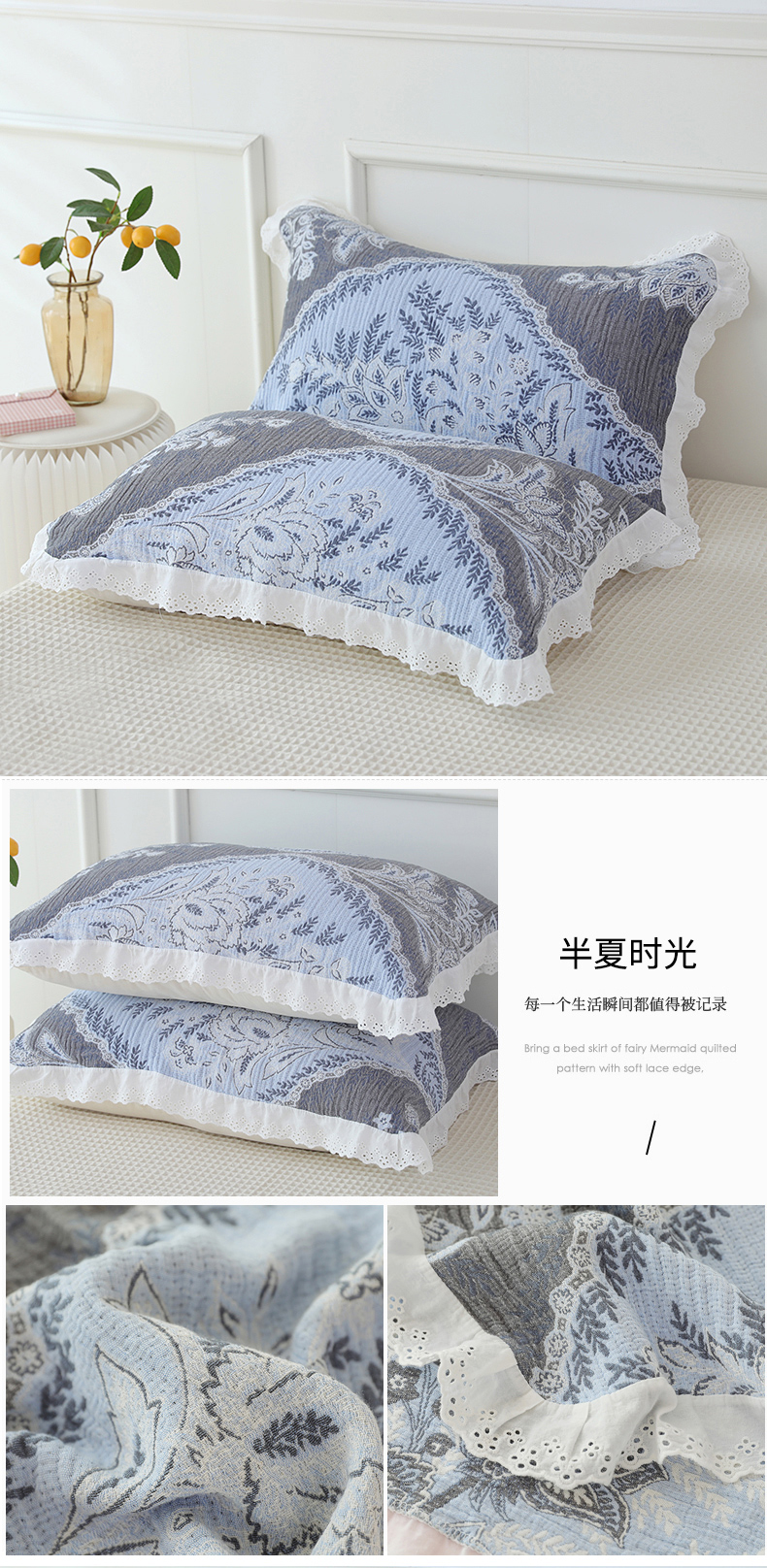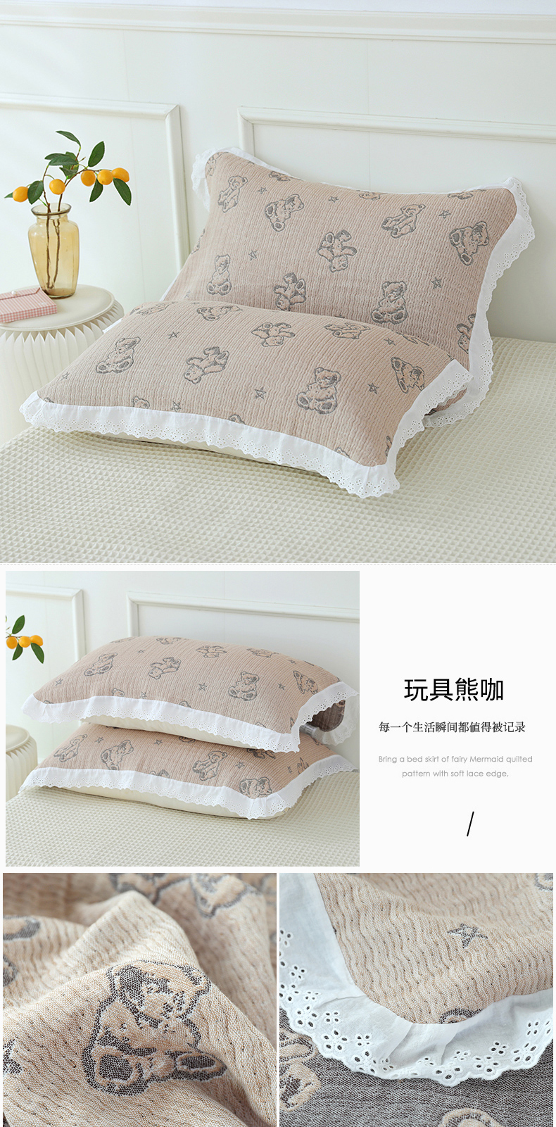 商品名称:(总)朴尔家纺-毛巾被 2026新款韩式花边四层纱枕巾纯棉竹纤维加大成人纱布枕头巾