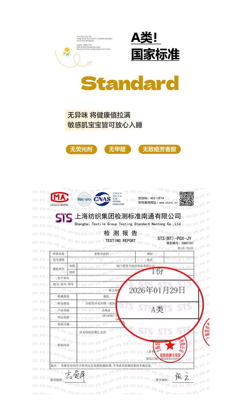 4、通州区市场监管局川姜分局友情提醒:近期针对抗静电,无静电,抗菌防螨,及有关舒适度,百分比的举报高发。为不影响商品正常销售,请各商家高度重视,自检自查及时整改,谢谢配合!
