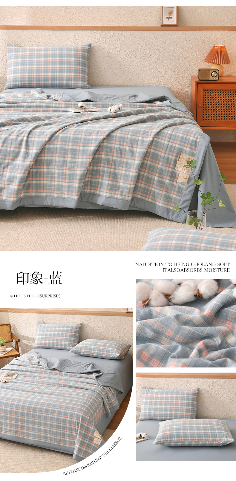 当前位置: 91家纺网 > 商品网购 > 被子 > 夏被 > 培童家纺 2026新款全棉色织水洗棉A类棉花夏被可机洗空调被四件套床单枕套 灰蓝