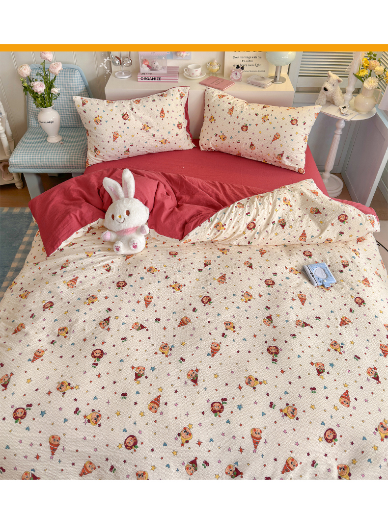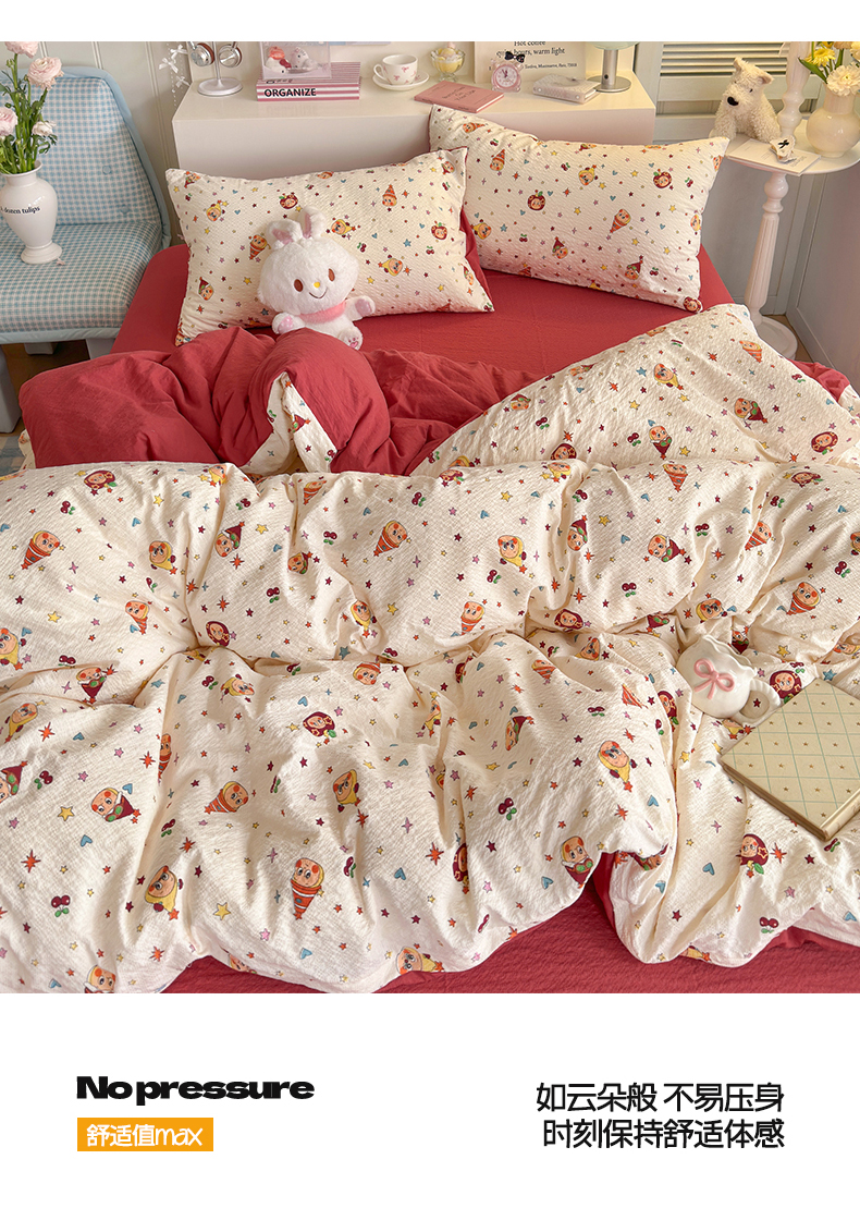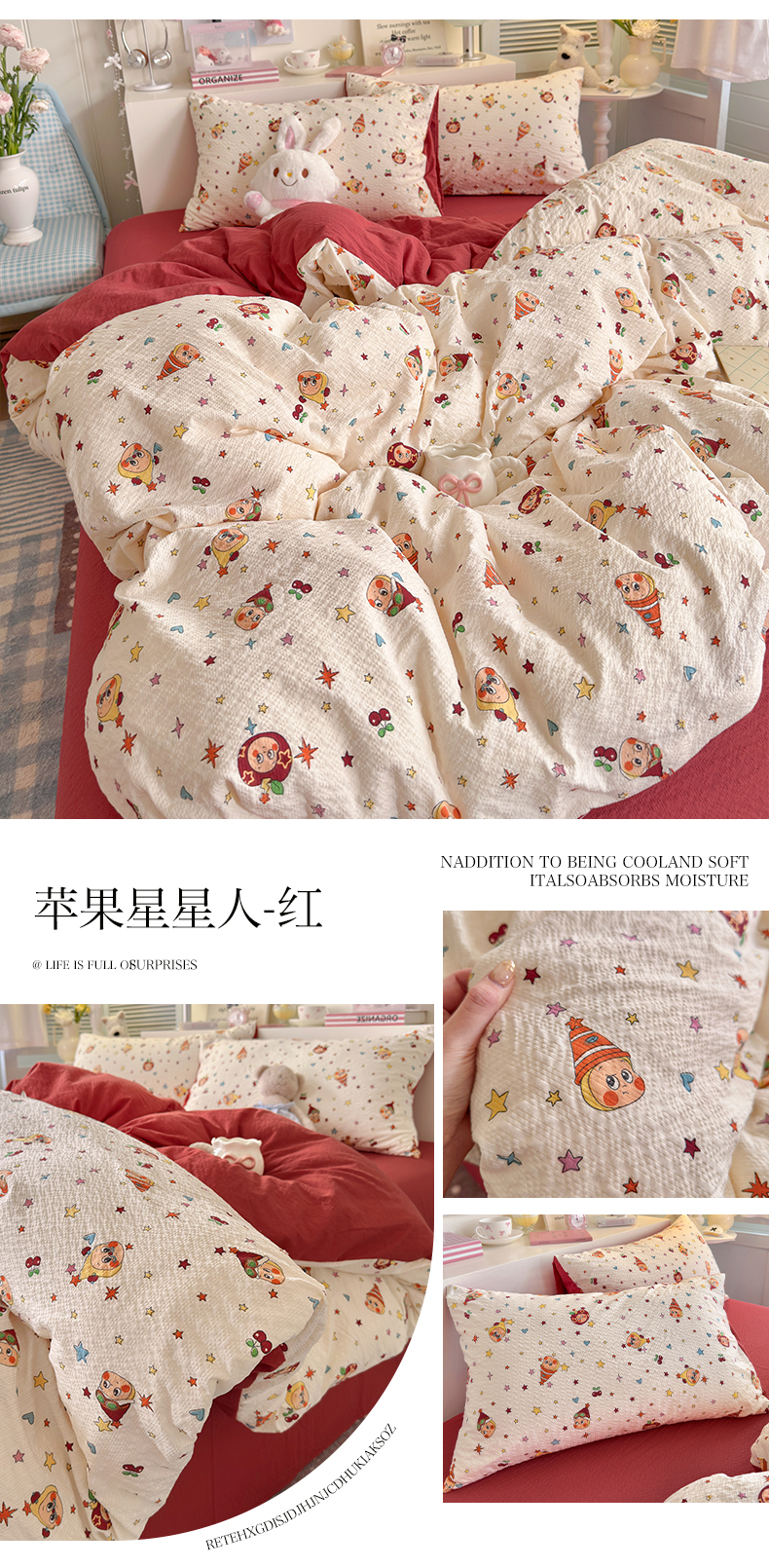 当前位置: 91家纺网 > 商品网购 > 床品套件 > 四件套 > 其它四件套 > 优选 2026新款小清新110g高品质直播热卖款A类泡芙棉双层纱四件套 苹果星星人-红