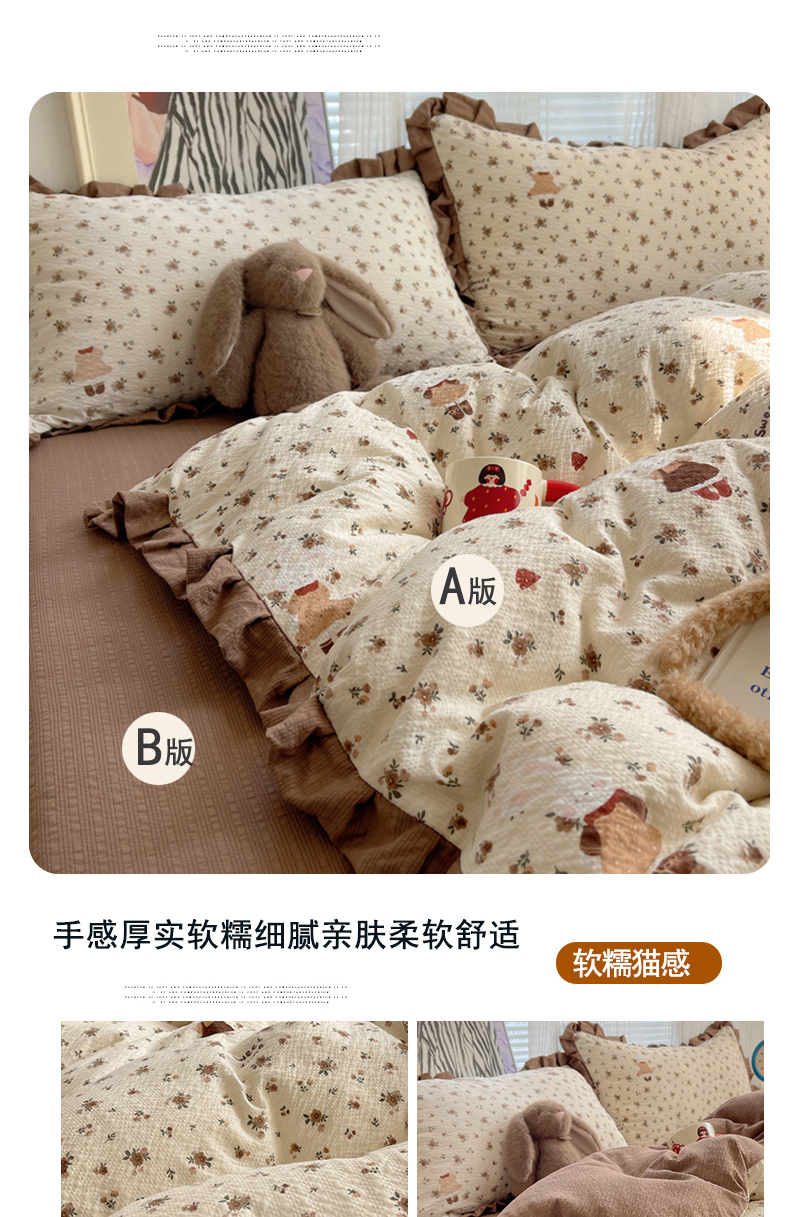 迪梦姿家纺 2026新款高克重泡芙纱泡泡纱床单款四件套系列 田园兔