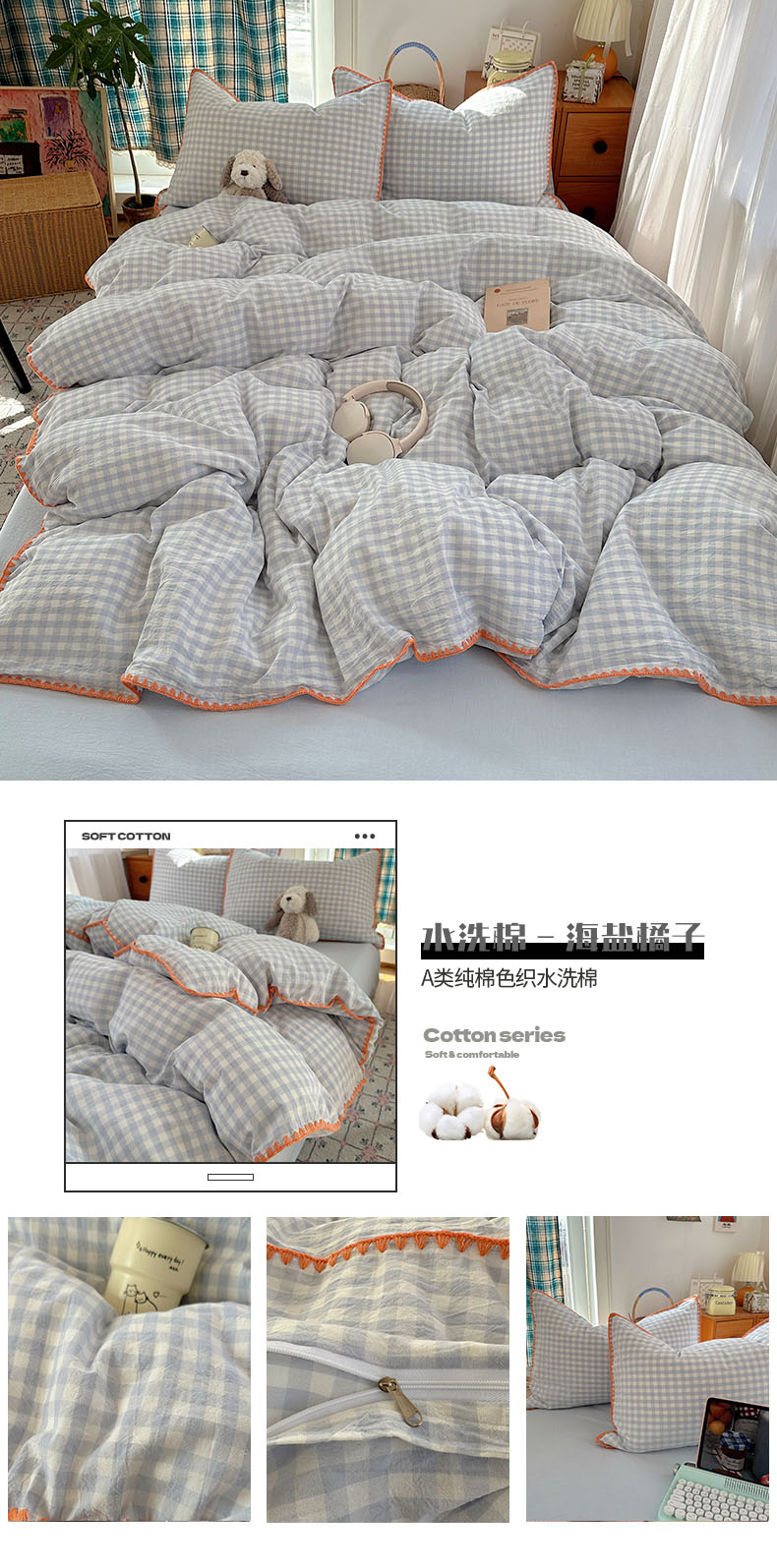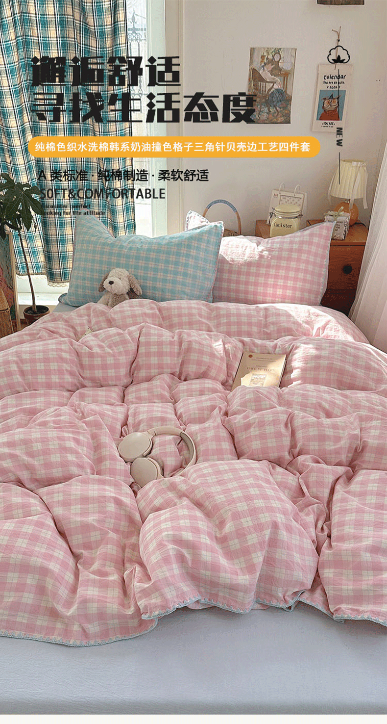 (总)桃子家居 2026新款A类纯棉色织水洗棉韩系奶油撞色格子三角针贝壳边工艺四件套系列,棉三角针-薄荷桃桃,棉三角针-海盐橘子,棉三角针-蓝雾桃格,棉三角针-蜜桃奶酥,棉三角针-奶黄青提,棉三角针-青柠薄荷,棉三角针-甜莓冰萃,棉三角针-紫雾芋泥