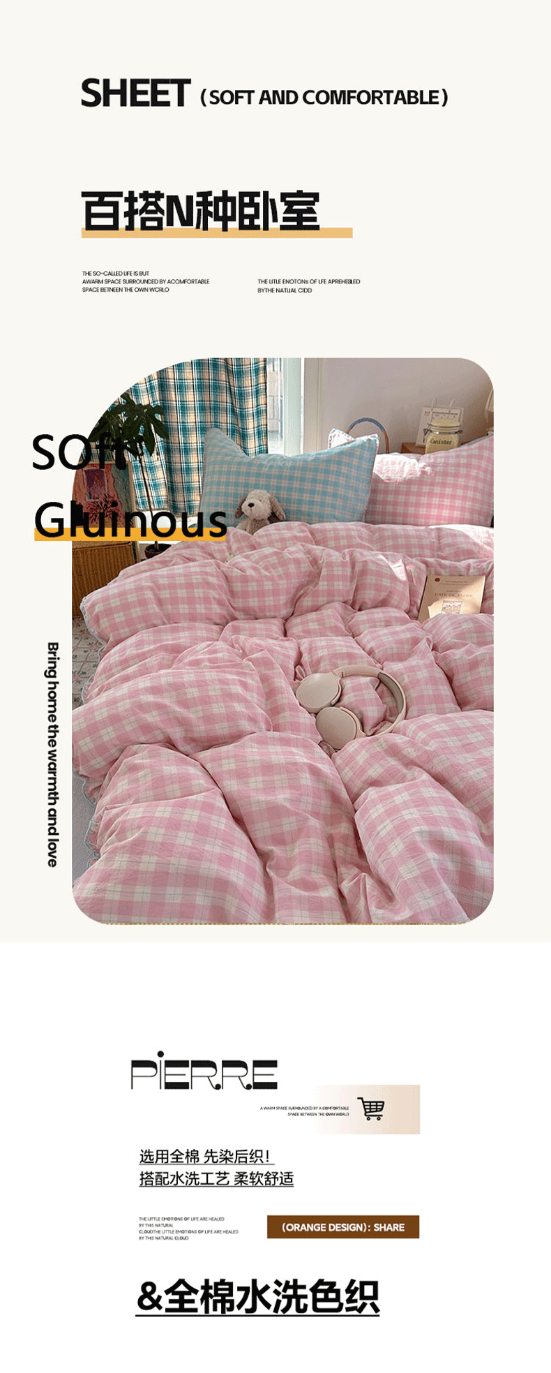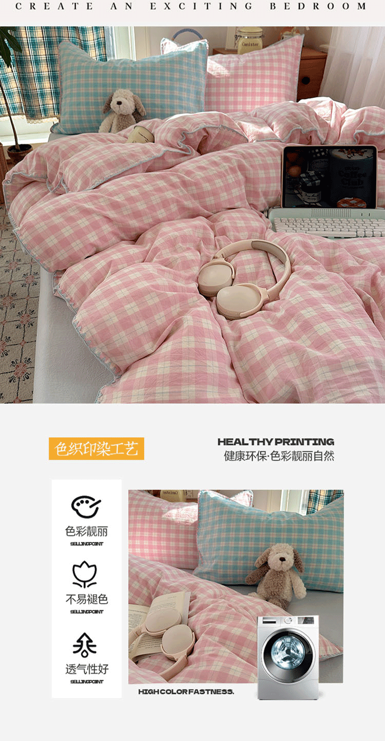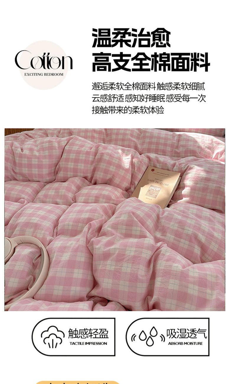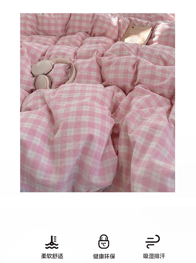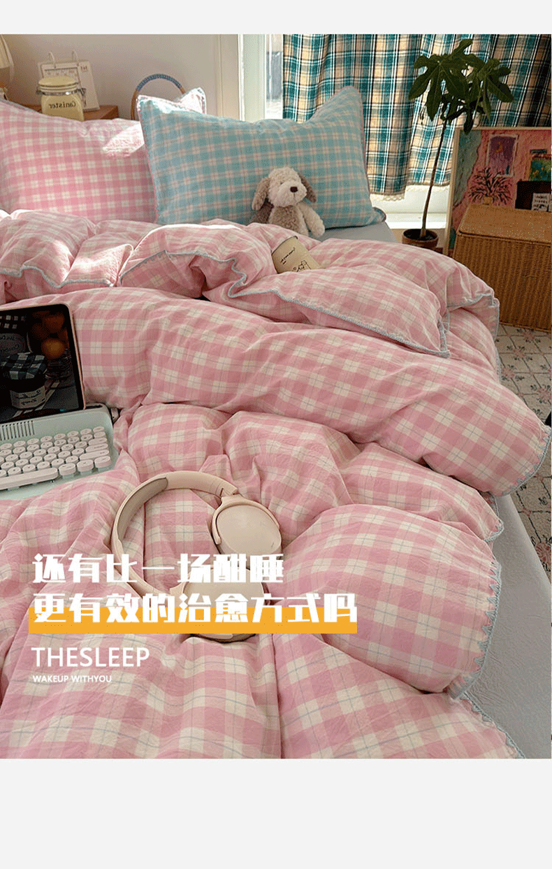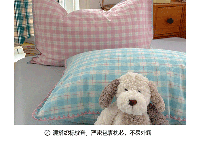 商品名称:桃子家居 2026新款A类纯棉色织水洗棉韩系奶油撞色格子三角针贝壳边工艺四件套系列 棉三角针-甜莓冰萃
