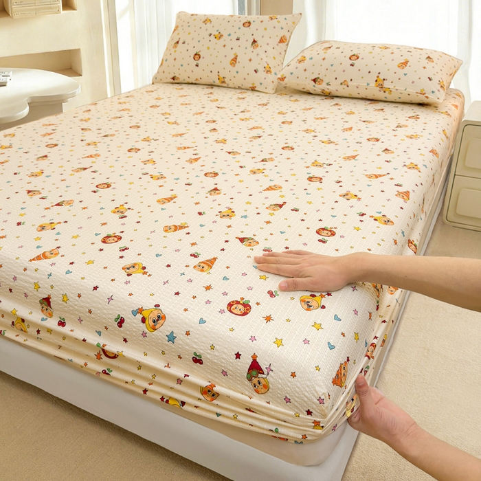 彩亿家纺 2026新款泡芙纱印花款床笠三件套云感泡芙双层纱套件单件床笠 猫猫乐园