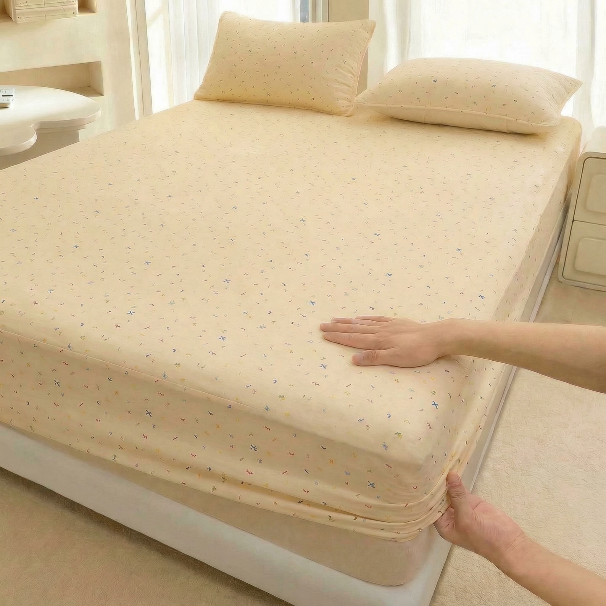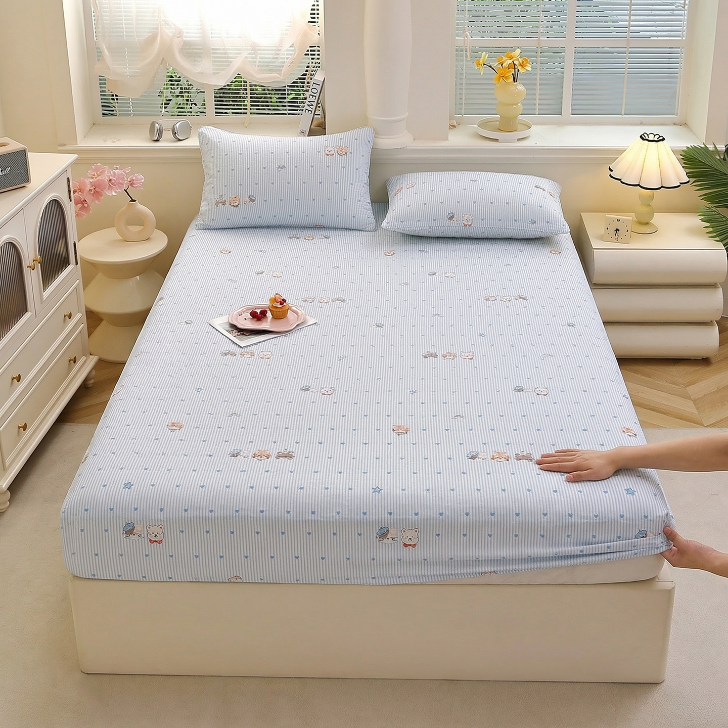 • 91家纺网 家纺一手货源 找家纺 (总)彩亿家纺 2026新款泡芙纱印花款床笠三件套云感泡芙双层纱套件单件床笠,旧街星星,星星糖豆,旋转木马,星星点点,猫猫乐园,萌马驾到,奶蓝蝴蝶,田园兔