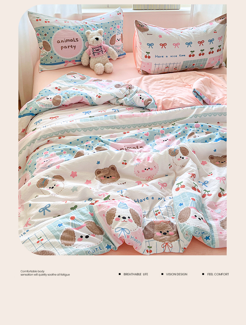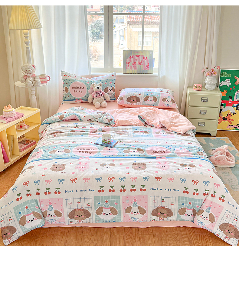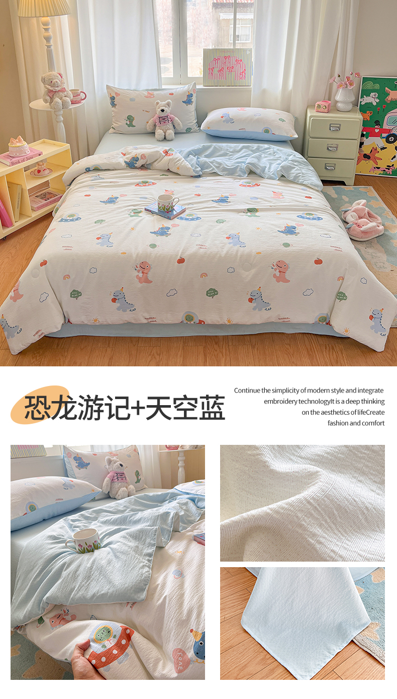 (总)盛秋家纺 2026新款皱皱纱印花夏被-萝拉,生日派对+清新绿,格子花园+奶油粉,格子铺粉+天空蓝,花丛小熊+奶油粉,可可颂蓝+天空蓝,恐龙游记+天空蓝,快乐时光+深咖,麻薯团+米驼,派对狗+深咖,森林小象+奶油粉,小狗来信+奶油粉,小伙伴+米驼,小熊小花+麦绿,修勾咖+米驼