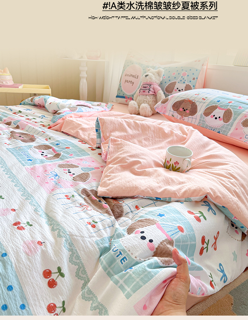 • 91家纺网 家纺一手货源 找家纺 盛秋家纺 2026新款皱皱纱印花夏被-萝拉 小狗来信+奶油粉