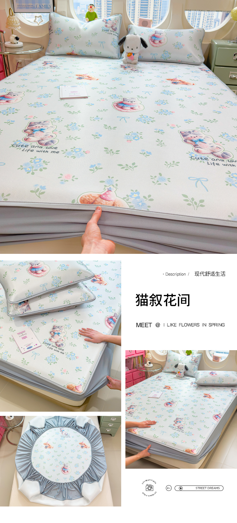 商品名称:丝羽坊 2026新款小版印花碳光冰丝凉席床笠款 猫叙花间