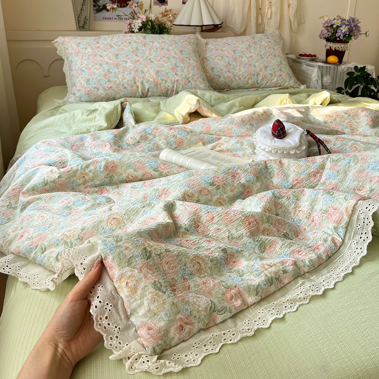商品名称:一比一家纺 2026新款彩色花边木棉皱皱纱夏被四件套 罗卡