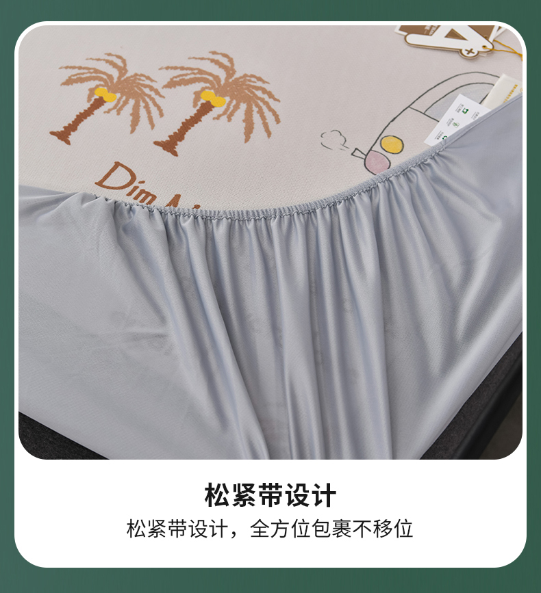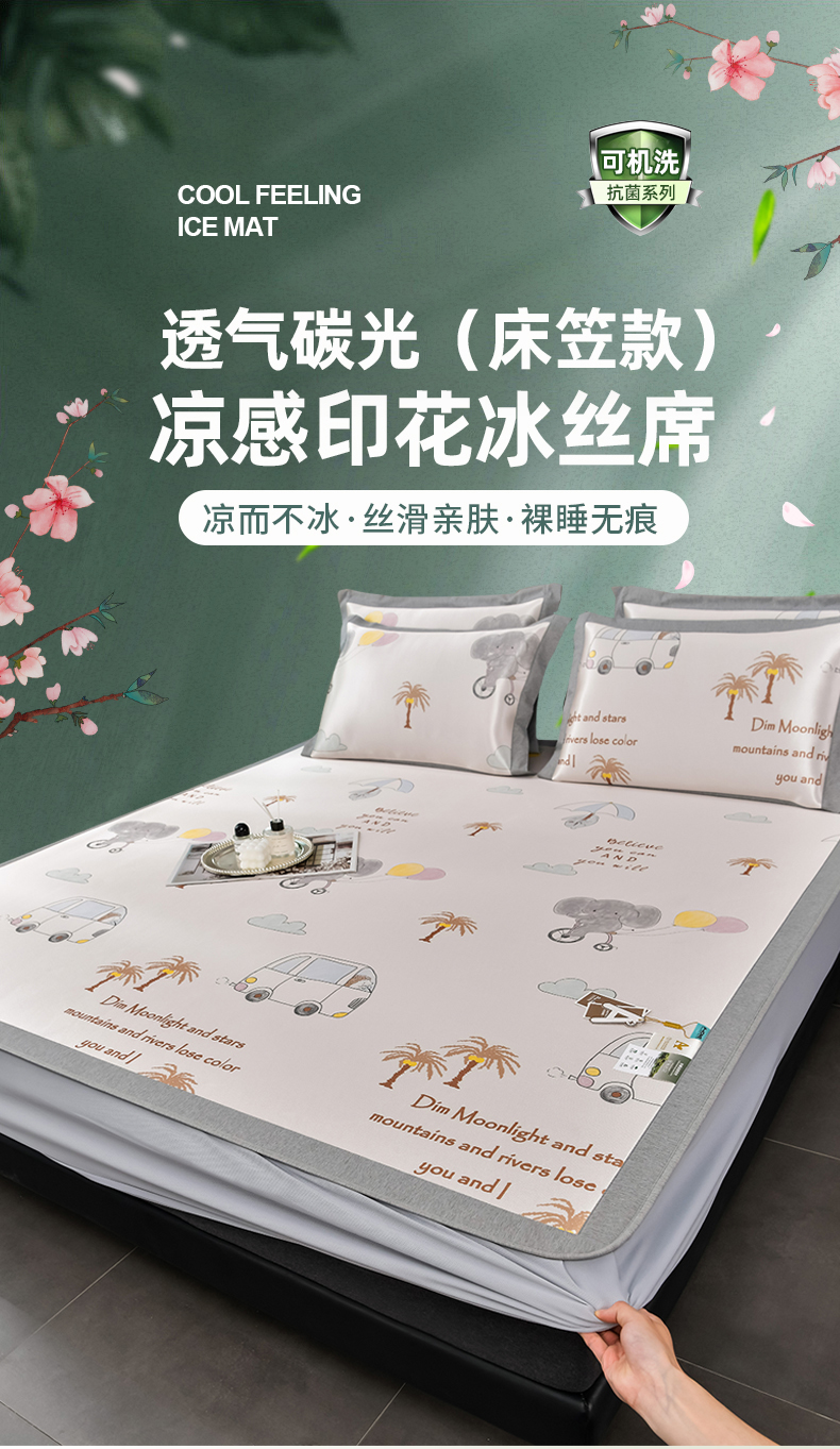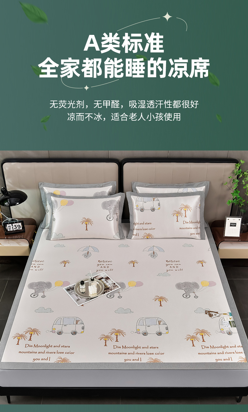 商品名称:小牛席业 2026新款加厚款碳光凉感印花冰丝席凉席席子(床笠款) 椰树与大象