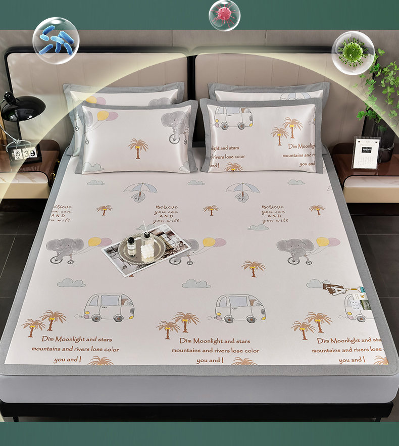 小牛席业 2026新款加厚款碳光凉感印花冰丝席凉席席子(床笠款) 椰树与大象
