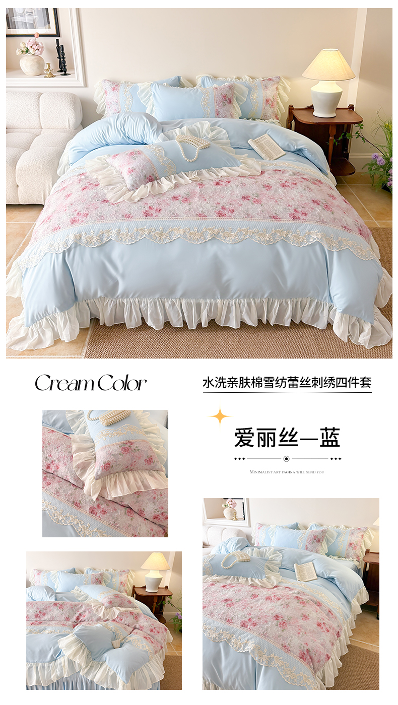 当前位置: 91家纺网 > 商品网购 > 床品套件 > 四件套 > 水洗棉四件套 > 富盛家纺 2026新款水洗亲肤棉蕾丝刺绣四件套-爱丽丝 爱丽丝—粉