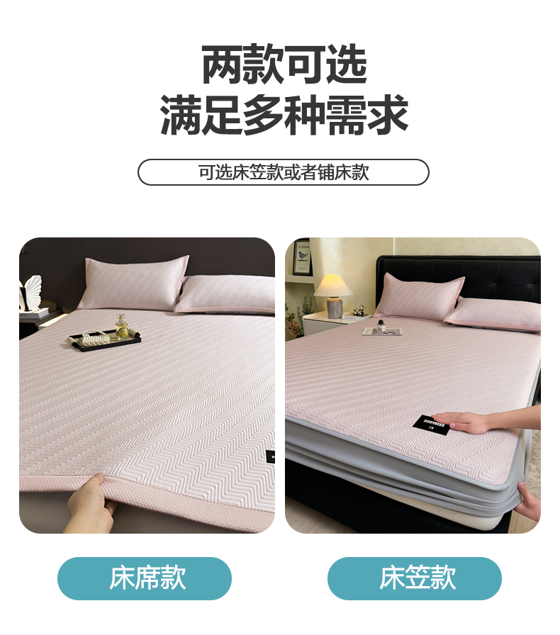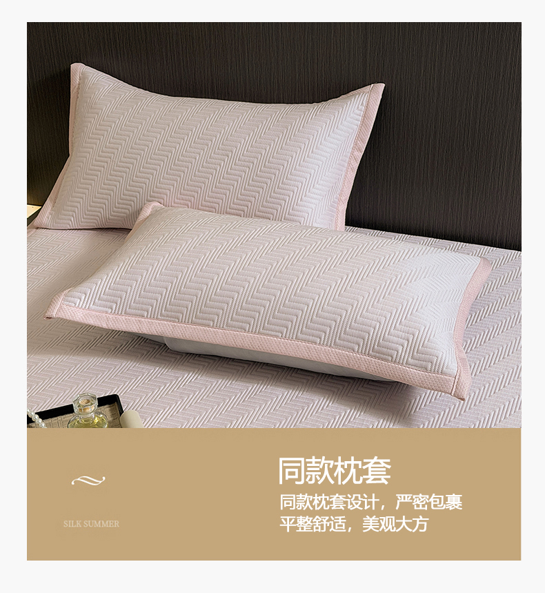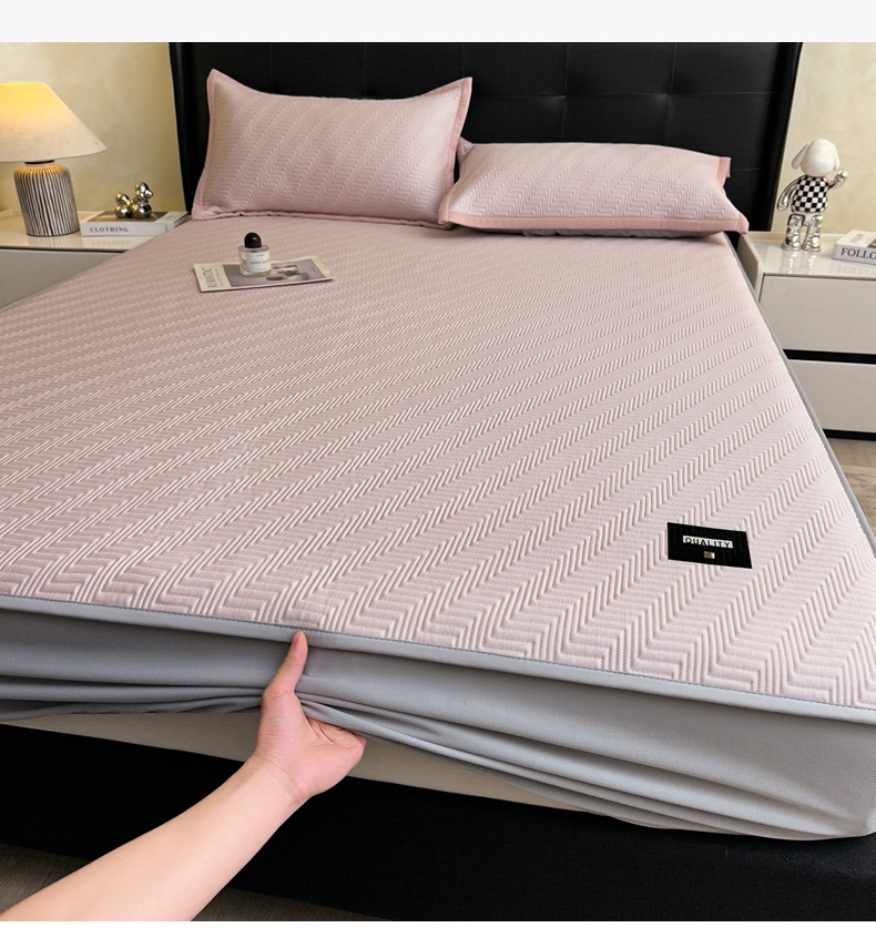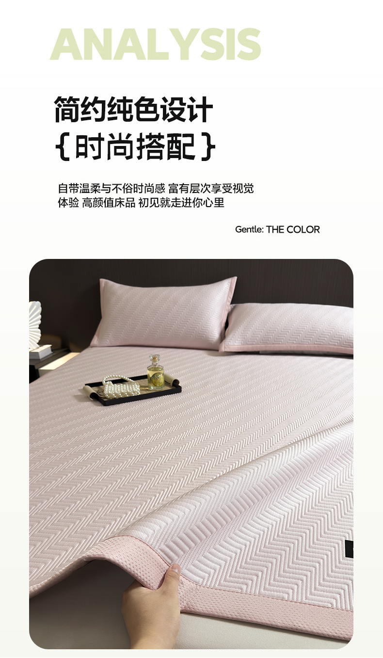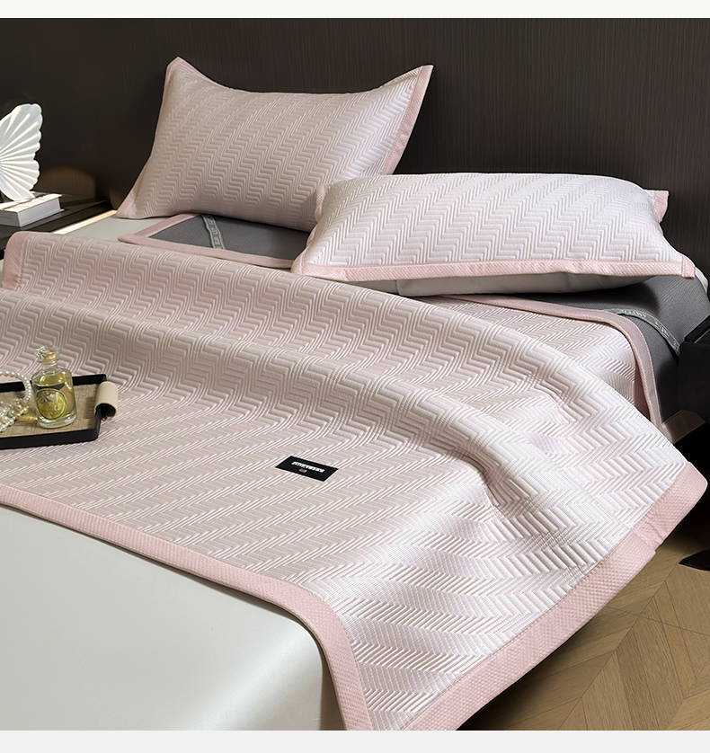 • 91家纺网 家纺一手货源 找家纺 慕木家纺 2026新款A类高克重三明治复合乙纶提花冰豆豆凉席床笠冰棱斜纹系列(提供买家秀) 冰棱斜纹-粉床席款