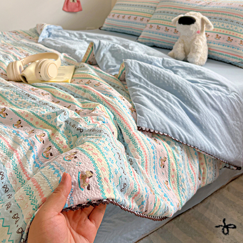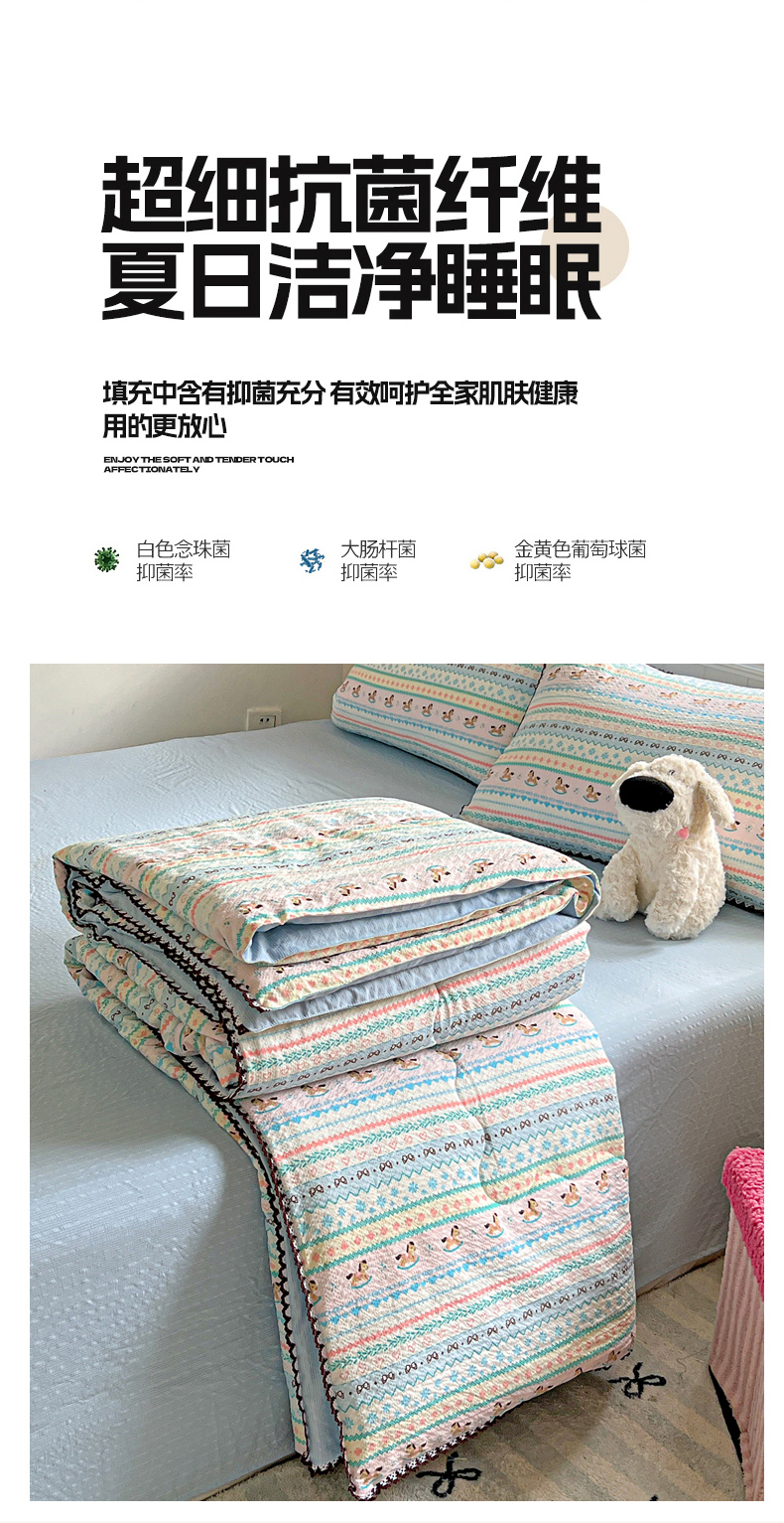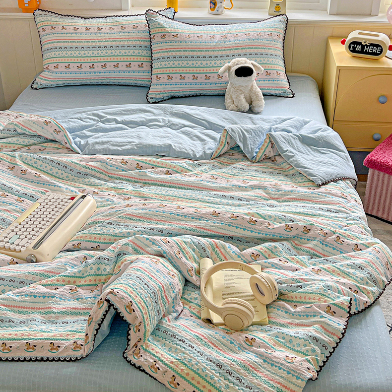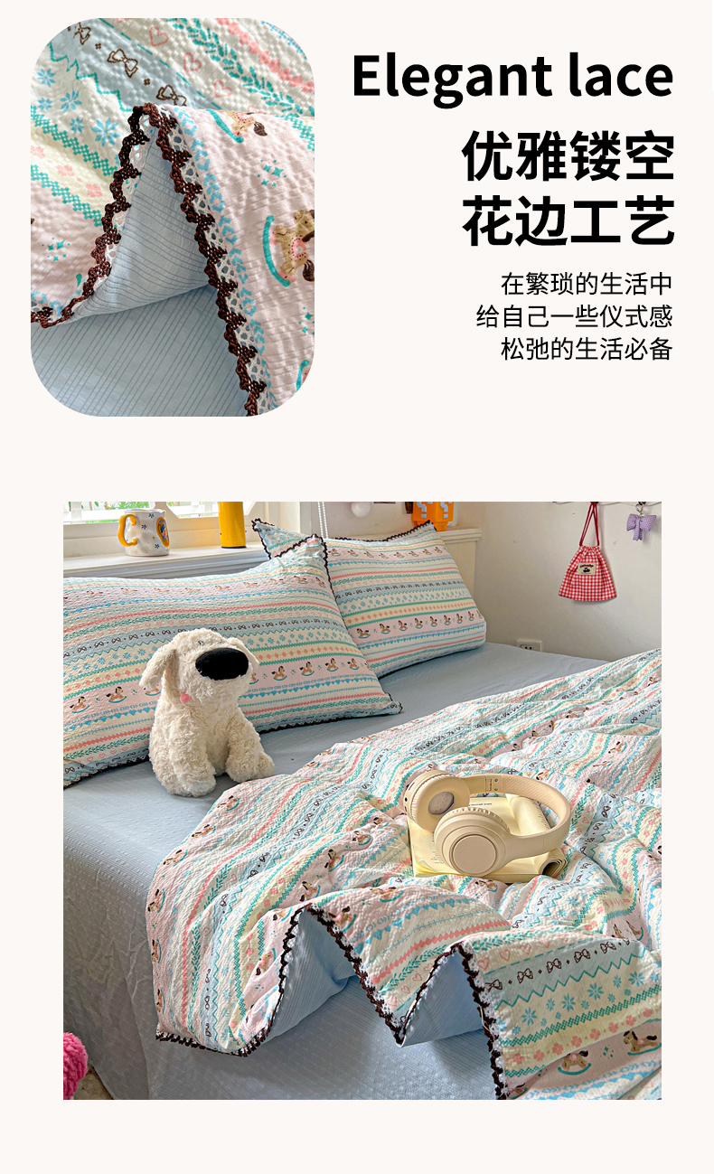 商品名称:恒尚居 2026新款A类泡芙纱贝壳边夏被四套件空调被三角针绣边夏被夏被四件套 【彩虹木马】小花边