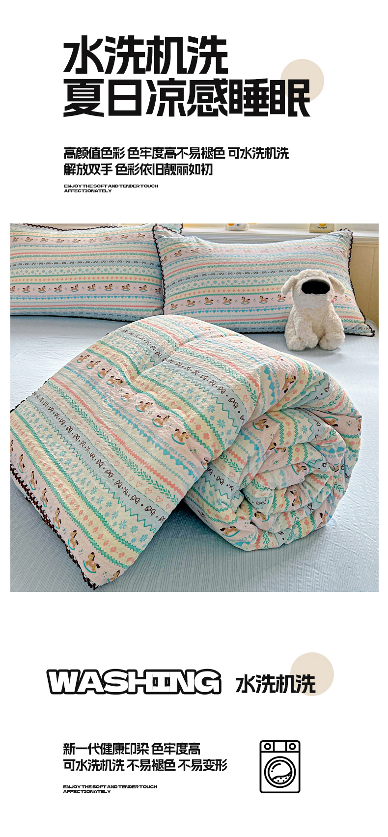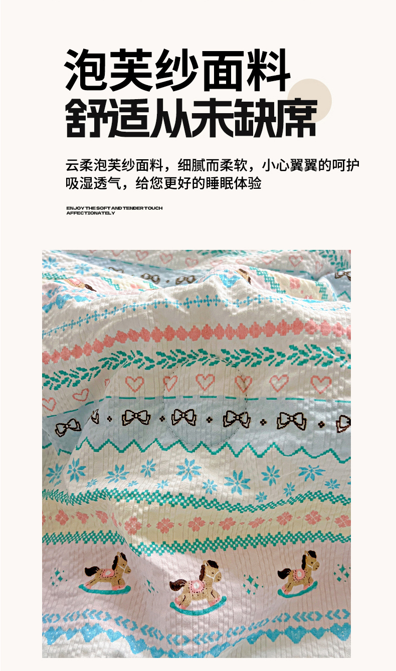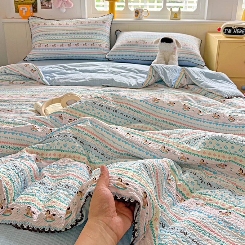 商品名称:恒尚居 2026新款A类泡芙纱贝壳边夏被四套件空调被三角针绣边夏被夏被四件套 【彩虹木马】小花边