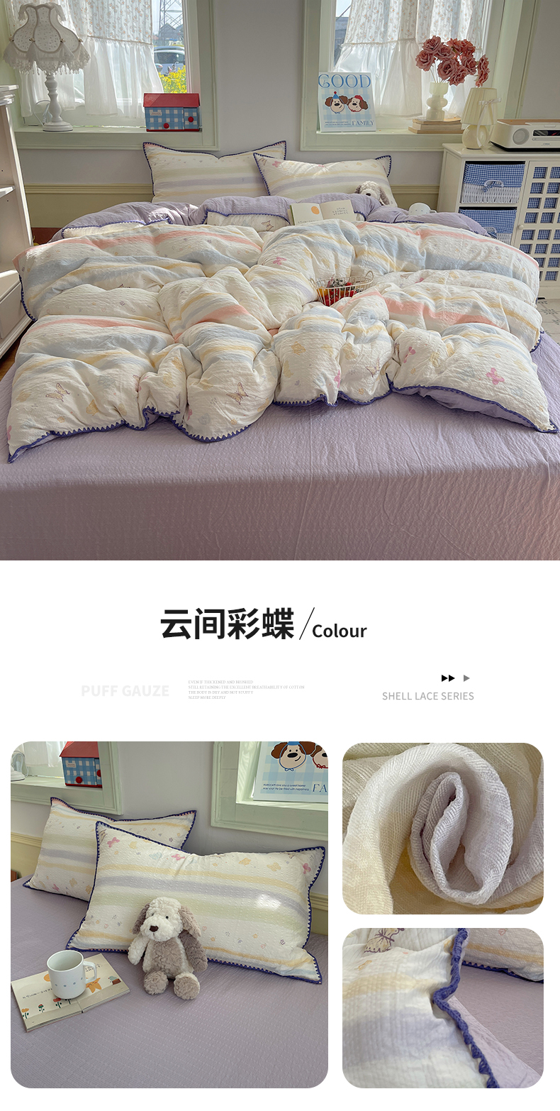 当前位置: 91家纺网 > 商品网购 > 床品套件 > 四件套 > 其它四件套 > 凯洛奇 2026春夏新款A类高品质泡芙纱贝壳边四件套 云间彩蝶