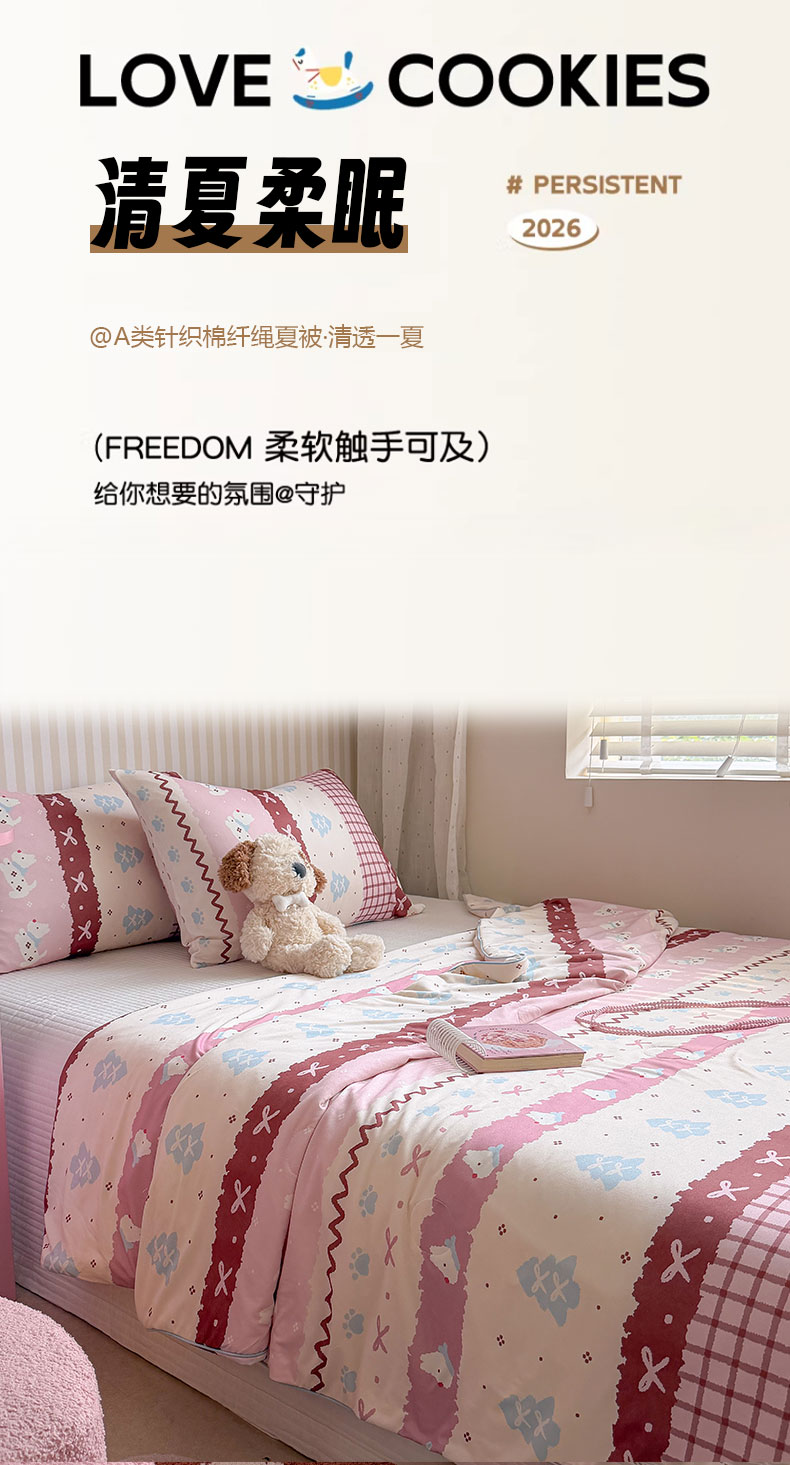 被子 > 夏被 > 桃子家居 2026新款A类卡通小清新奶乎乎高品质牛奶丝软糯针织棉嵌绳工艺夏被系列 针织嵌绳-莓果狗