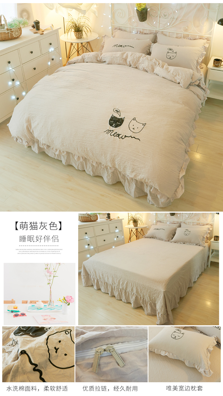 简爱家纺 2025新款水洗棉绣花四件套床单款 萌猫灰色