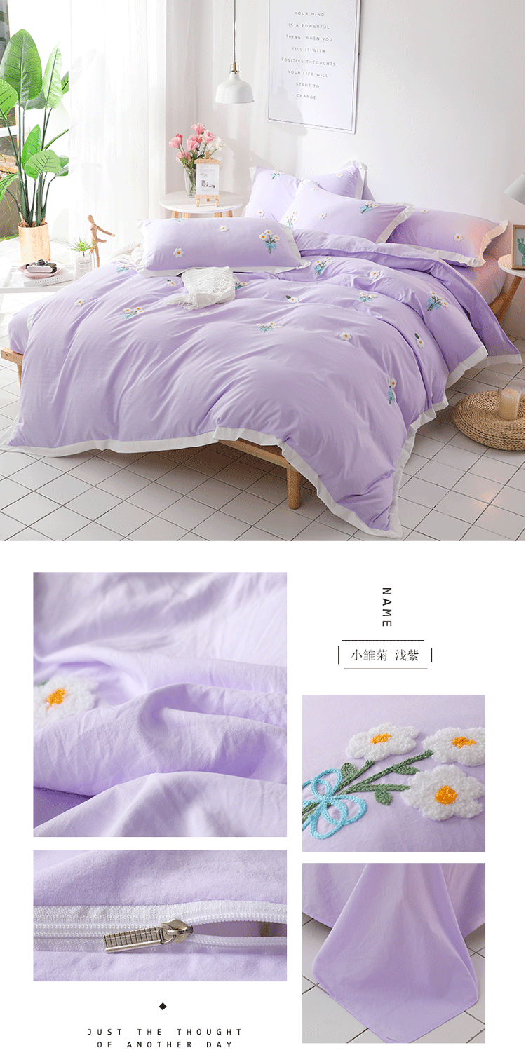 (总)雨菲家纺2025 网红爆款水洗棉小雏菊毛巾绣拼角宽边花边四件套,粉玉色,姜黄色,浅绿色,浅紫色,小橘子-白加粉