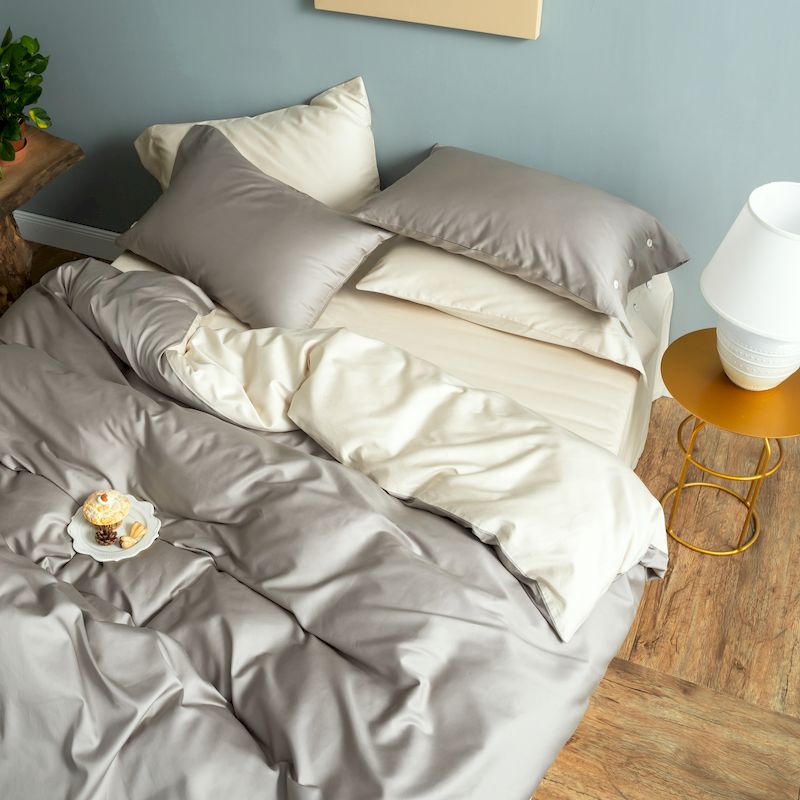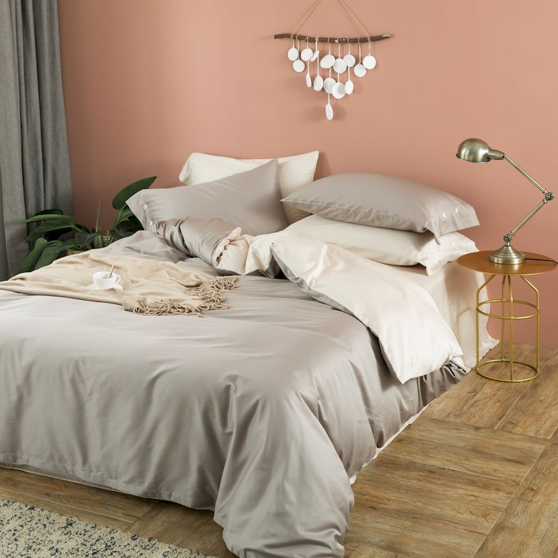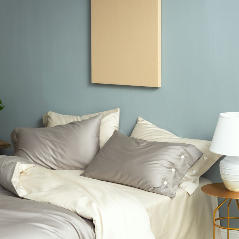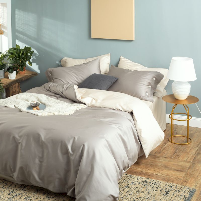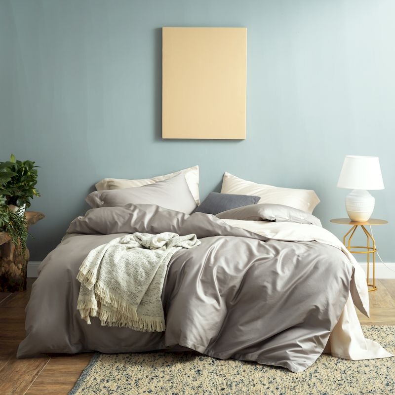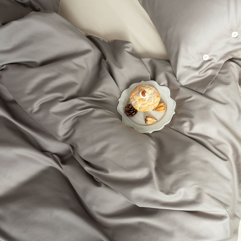 涞澳家纺2019新款60长绒棉平色二简易四件套亚麻灰配冰灿银