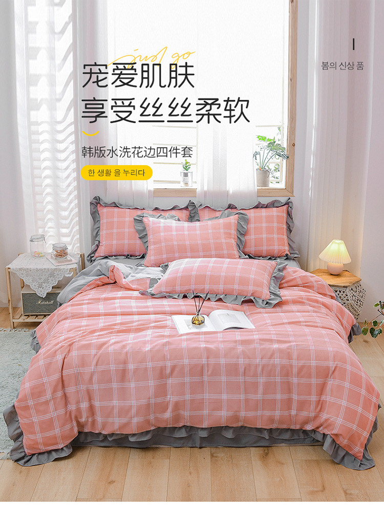 绒兔兔 2021韩版水洗棉时尚格四件套 粉灰