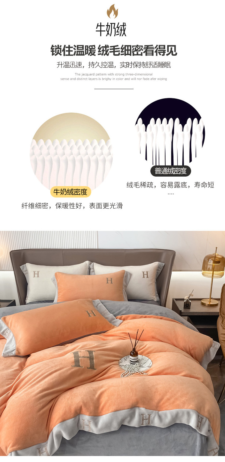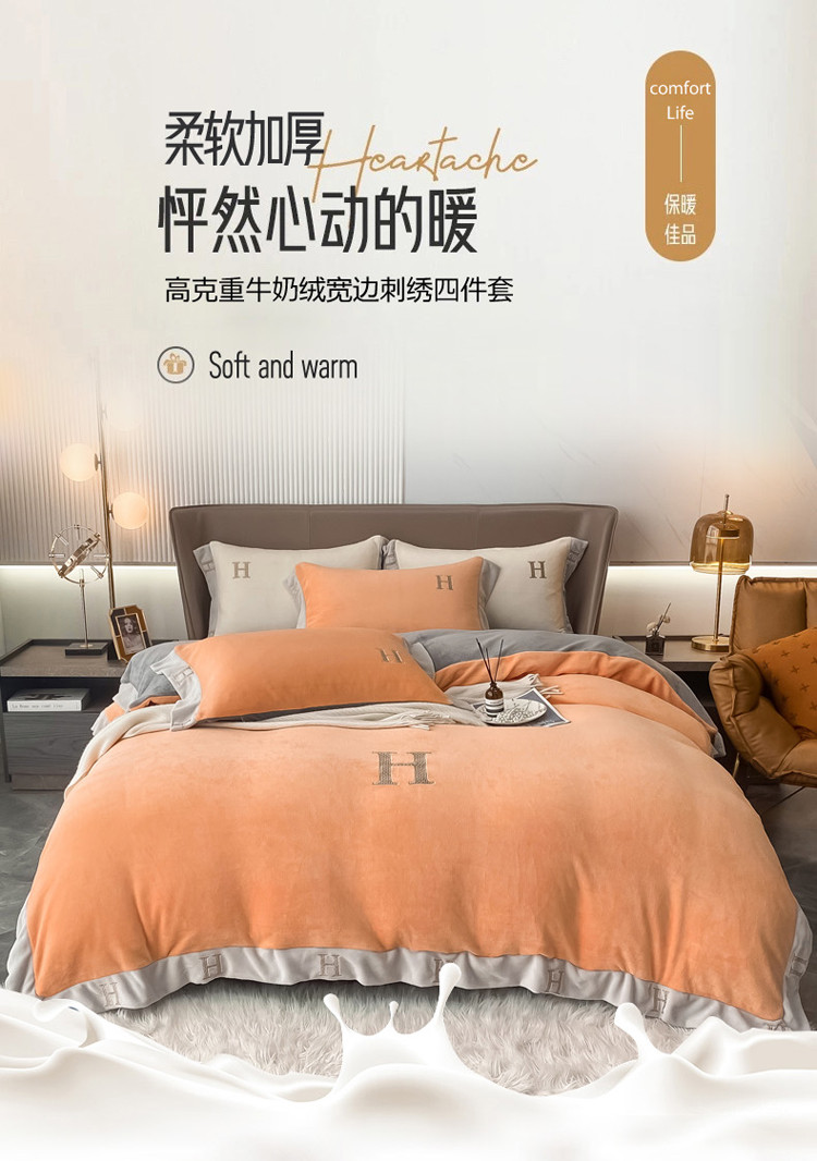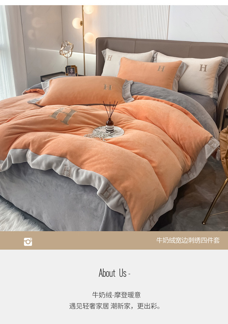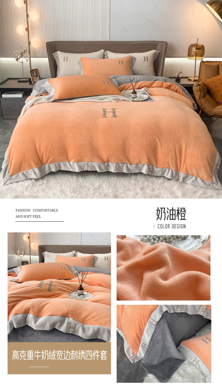 米莱家纺 2021新款高克重牛奶绒宽边刺绣四件套 奶油橙