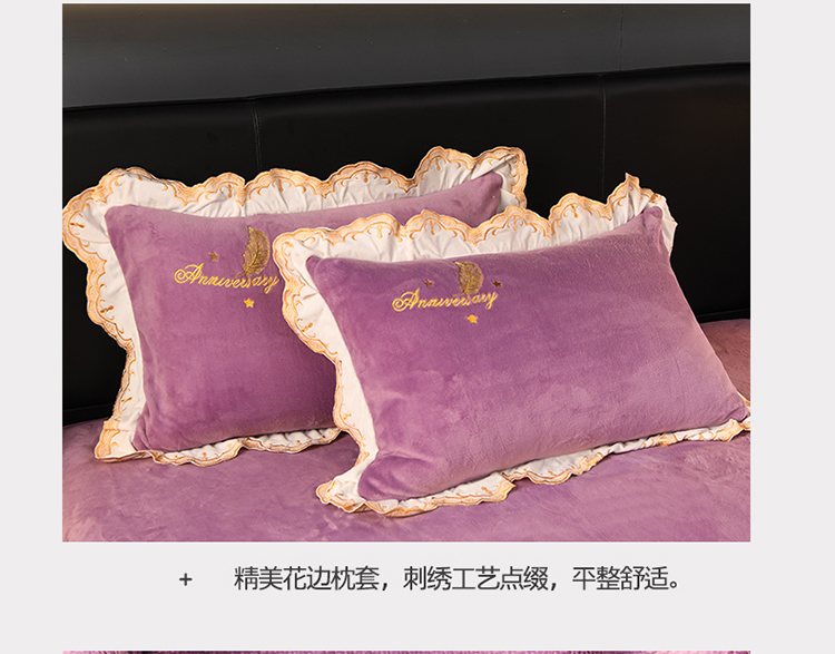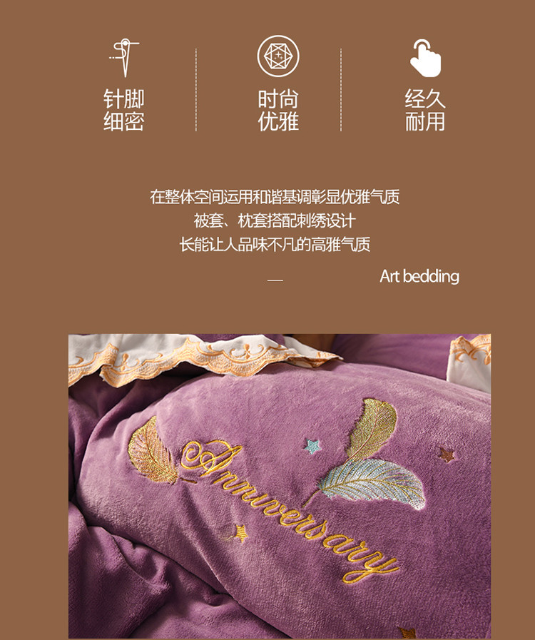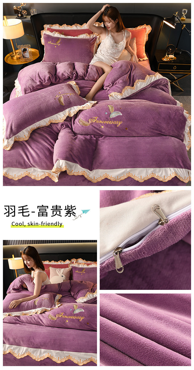 商品名称:眠帛家居 2021新款秋冬牛奶绒刺绣工艺四件套 羽毛-富贵紫