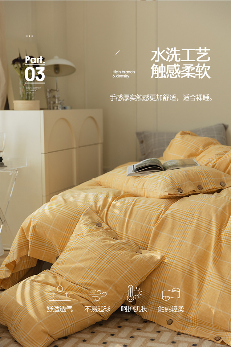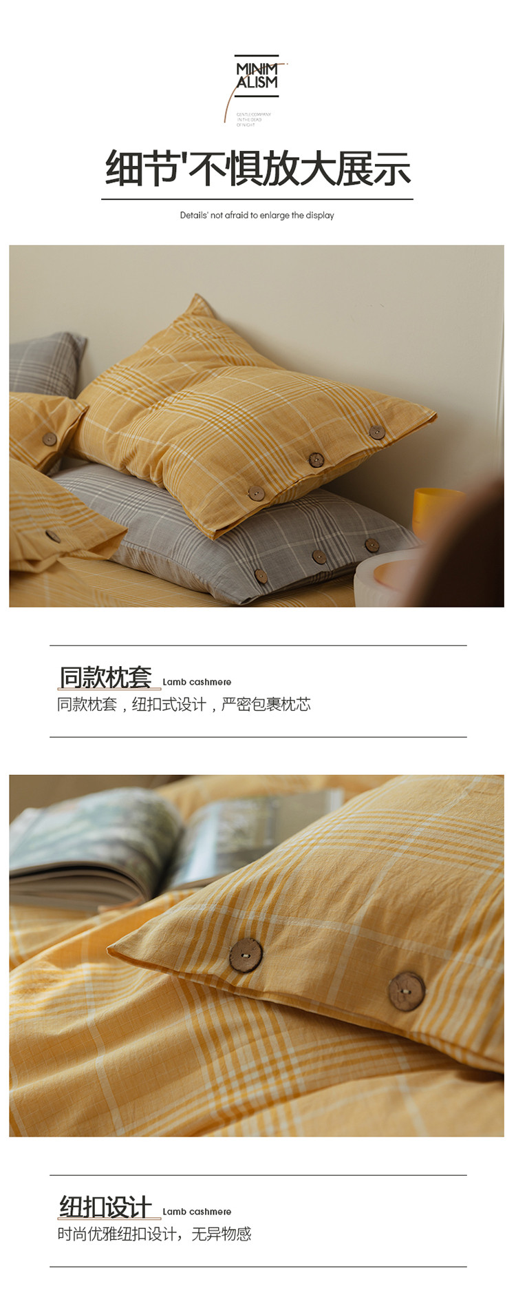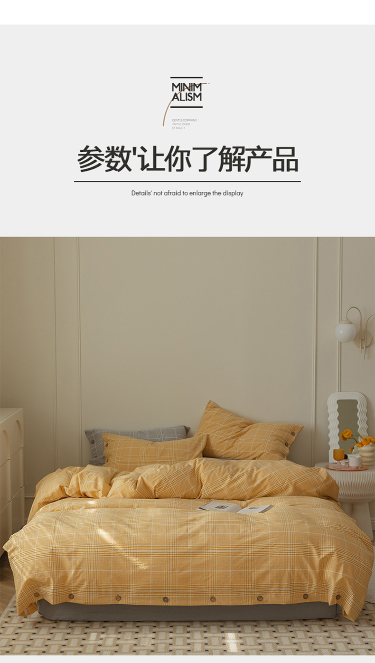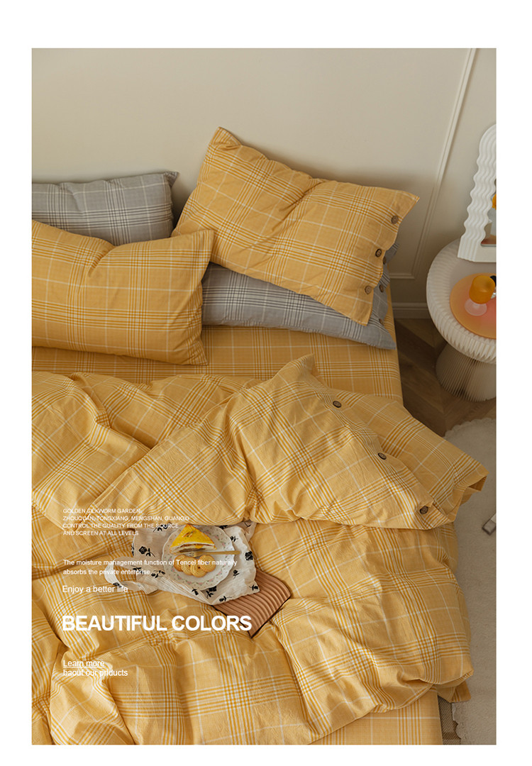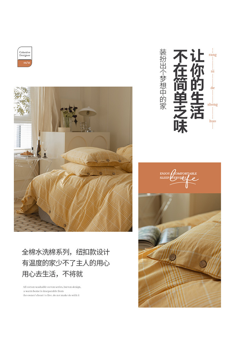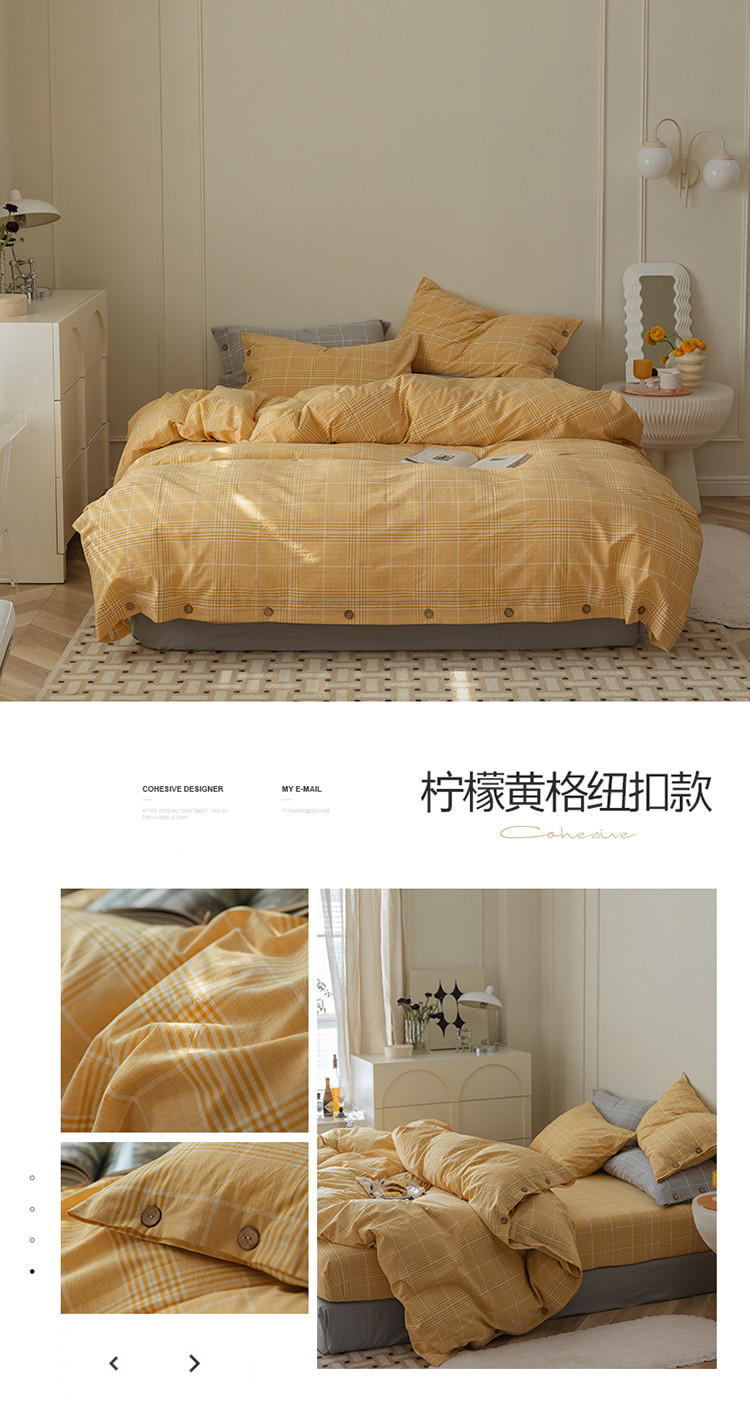 当前位置: 91家纺网 > 商品网购 > 床品套件 > 四件套 > 水洗棉四件套 > 寐眠 22年A类水洗棉全棉纽扣款四件套 柠檬黄格纽扣款