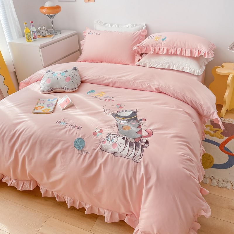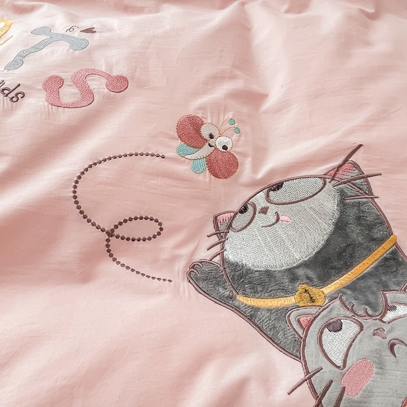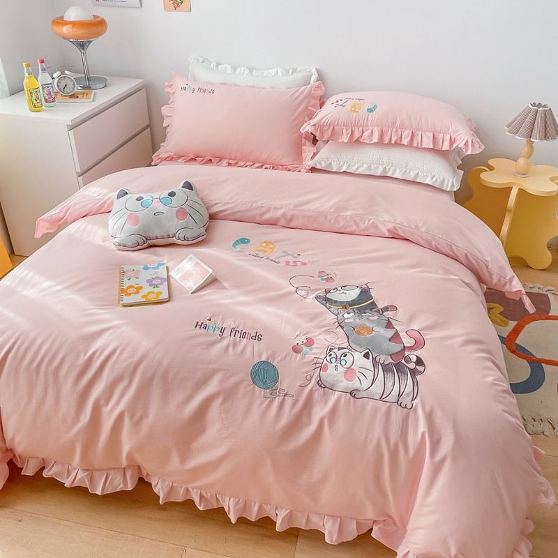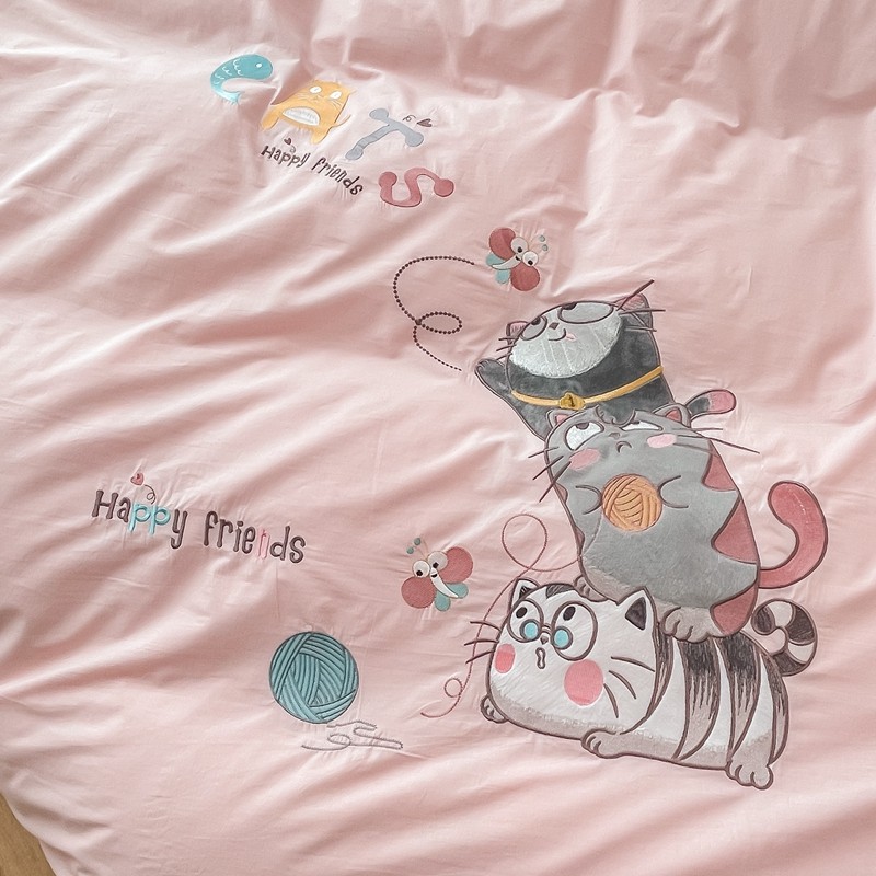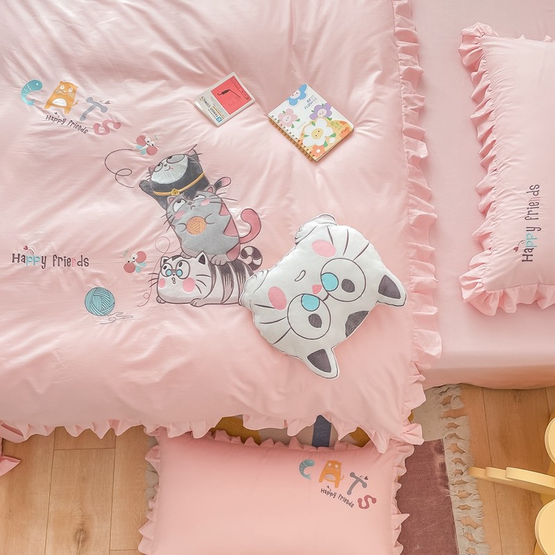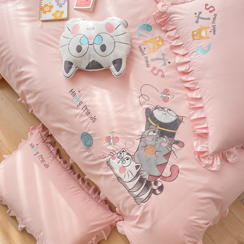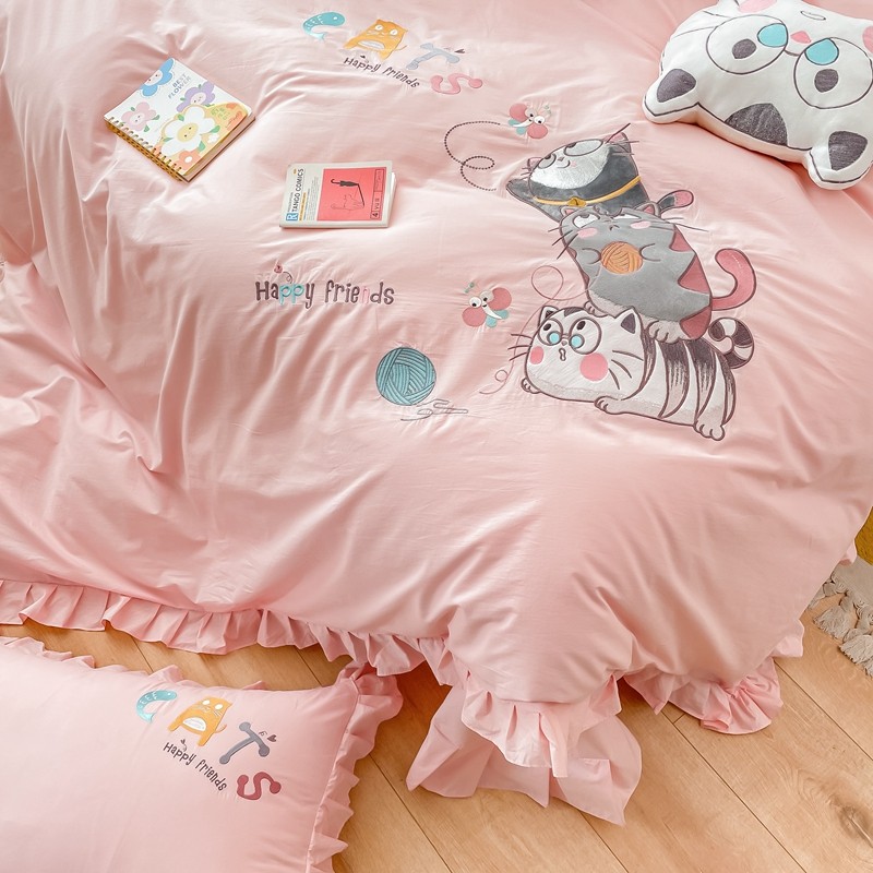 凡客 新款全棉色织水洗棉贴布绣花边四件套 快乐萌猫-粉