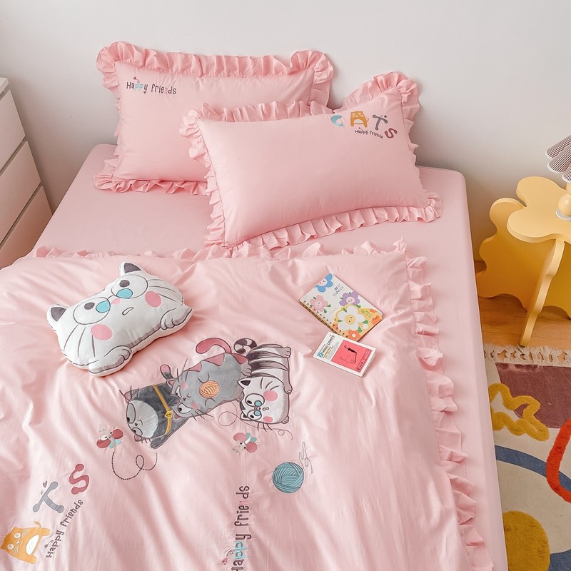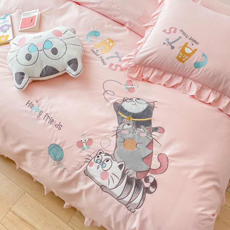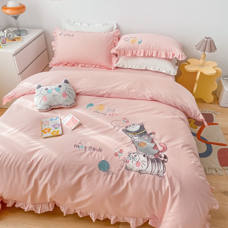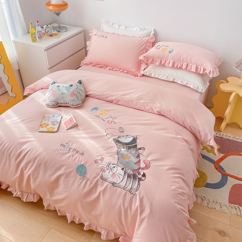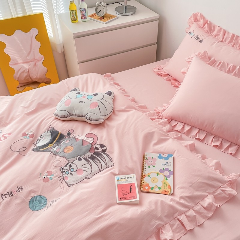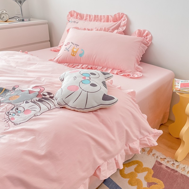 凡客 新款全棉色织水洗棉贴布绣花边四件套 快乐萌猫-粉