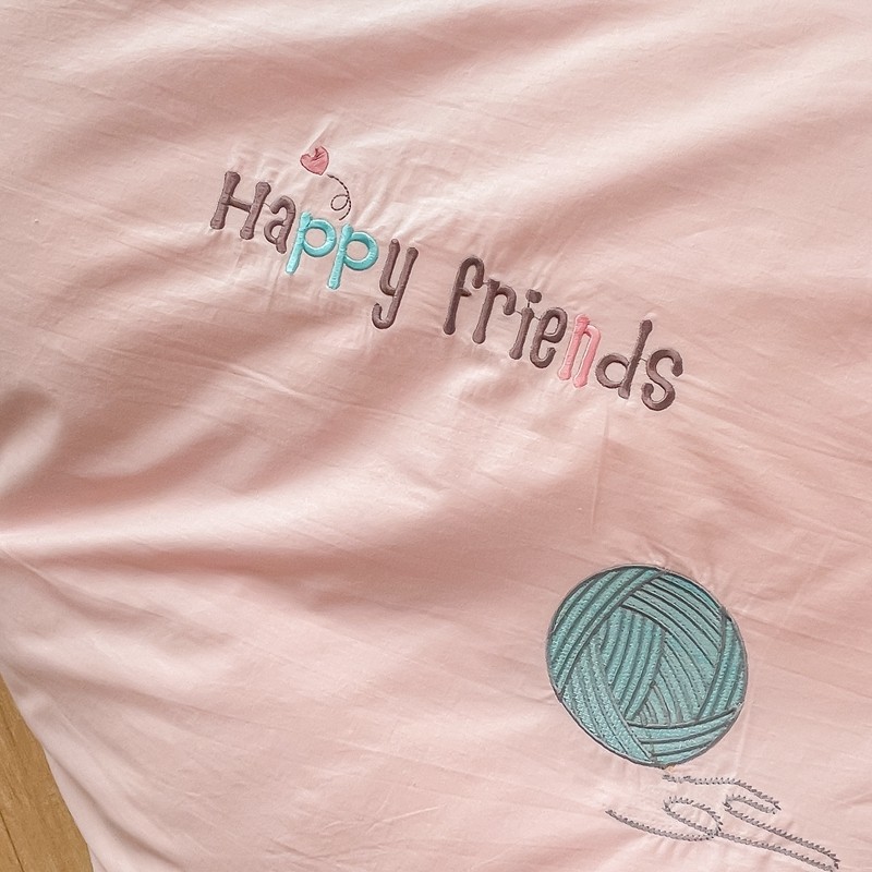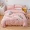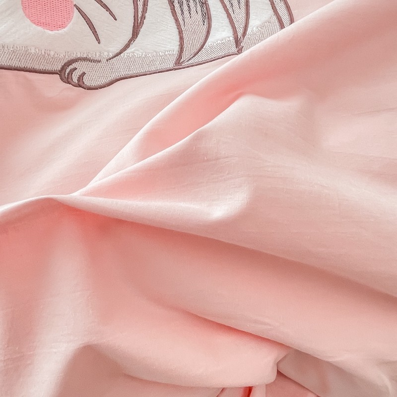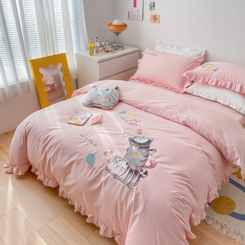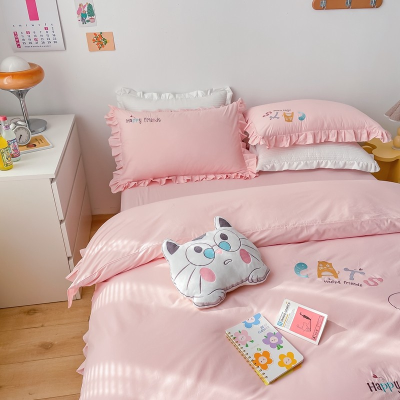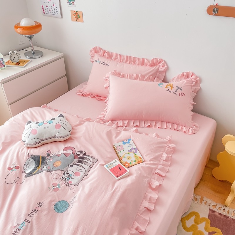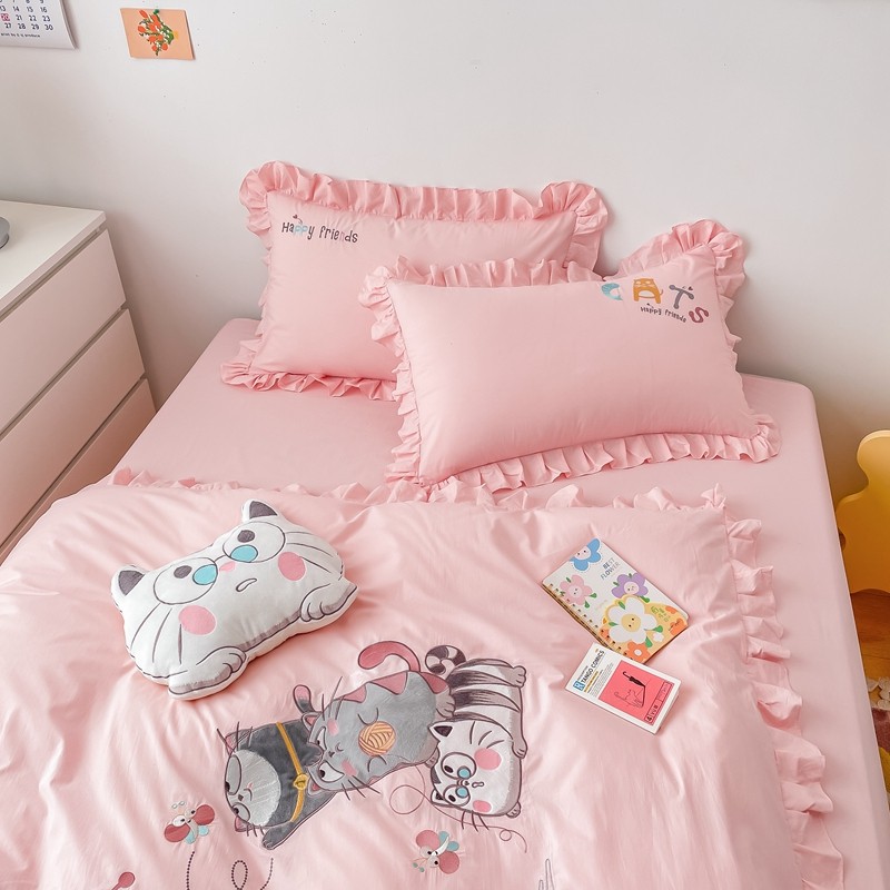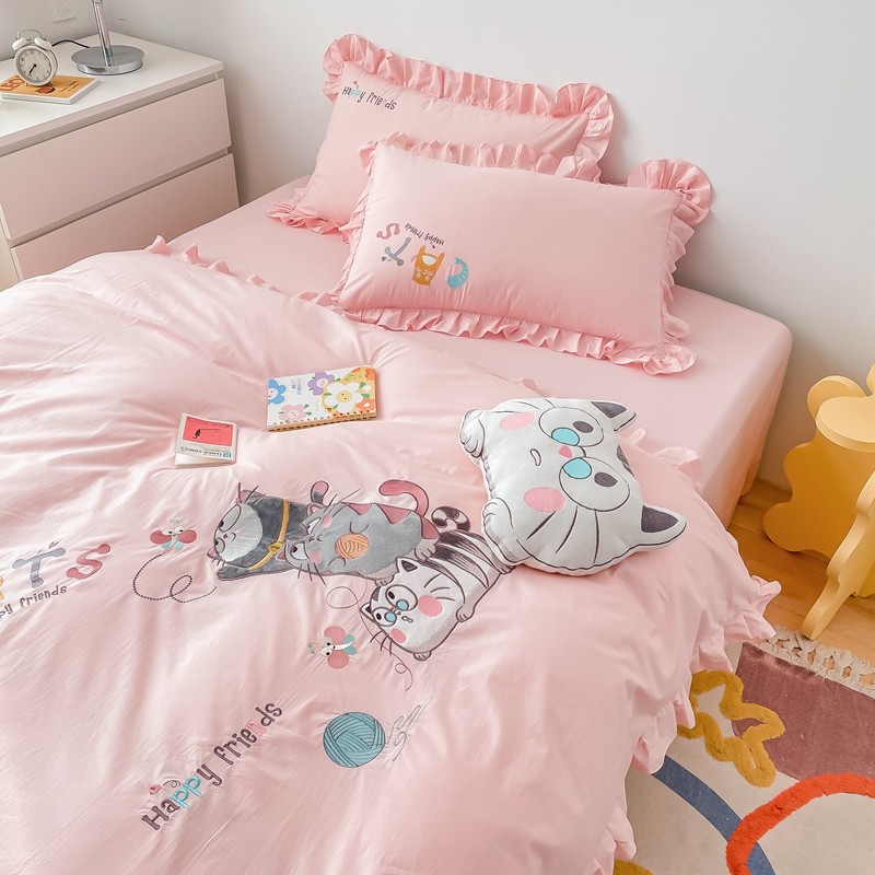 凡客 新款全棉色织水洗棉贴布绣花边四件套 快乐萌猫-粉