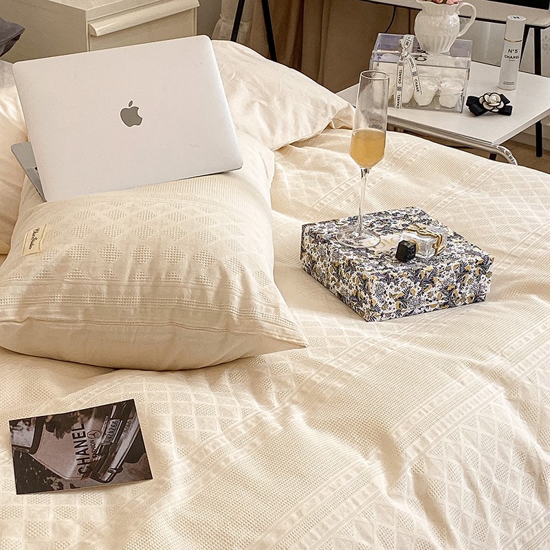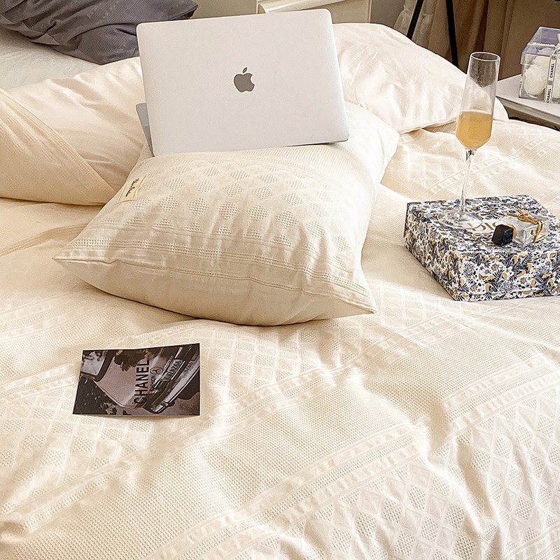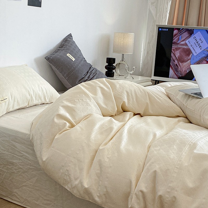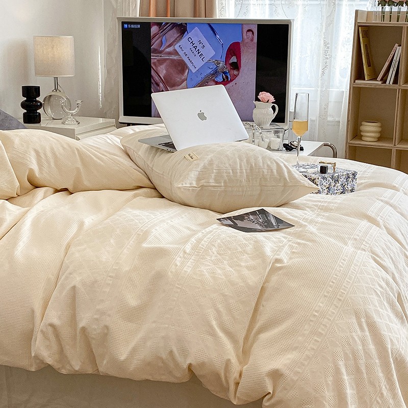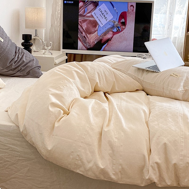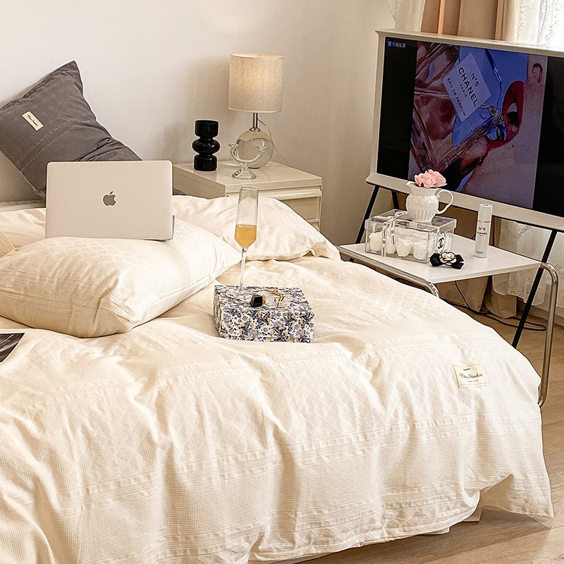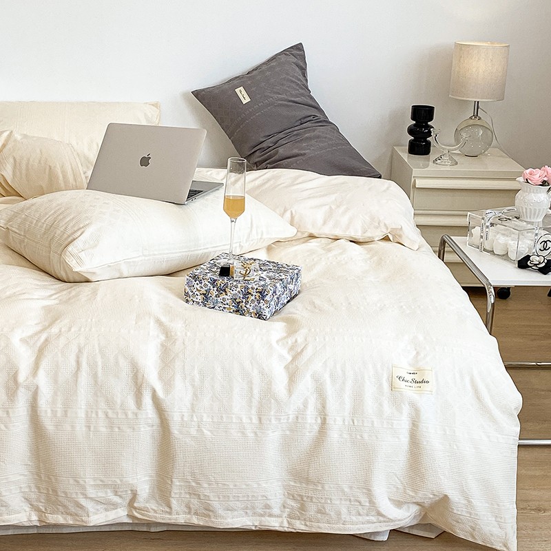 昔可 2022新款60支水洗棉华夫格提花四件套拍法一 四花格米白