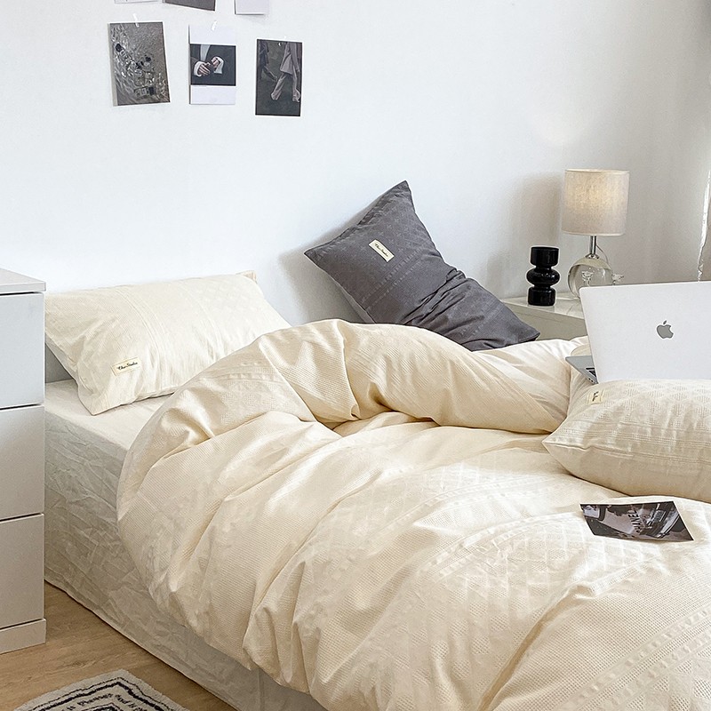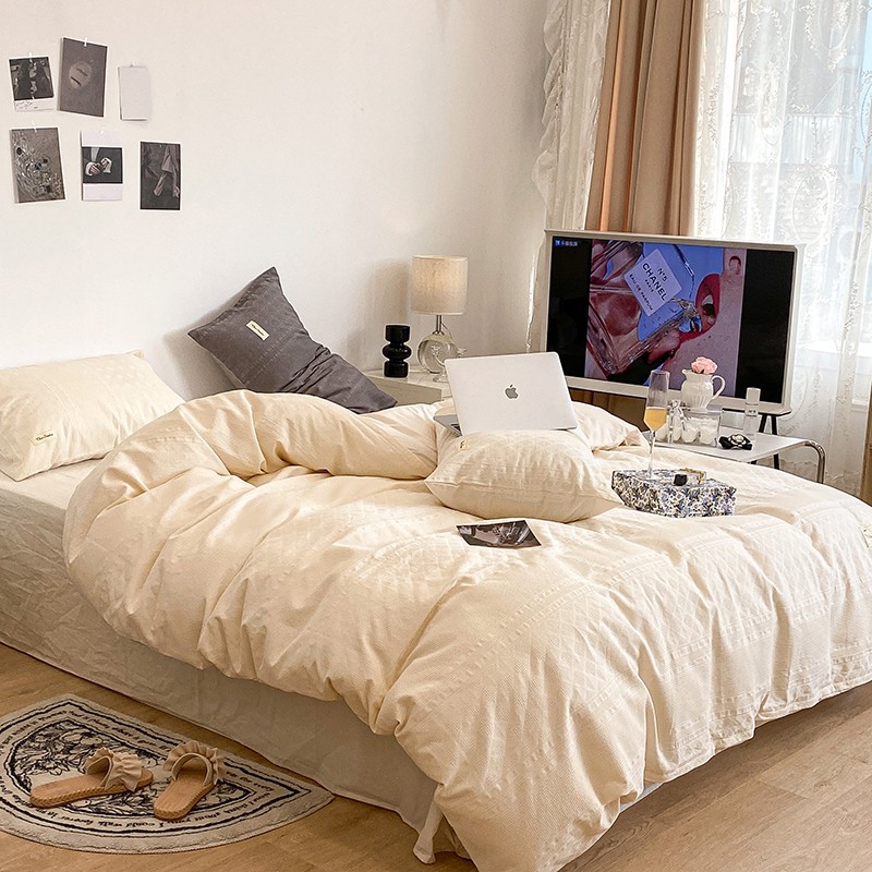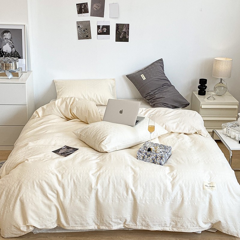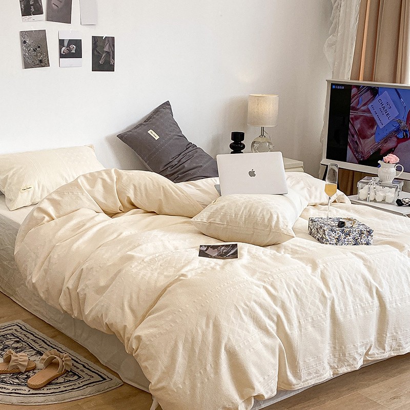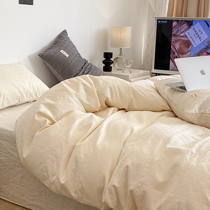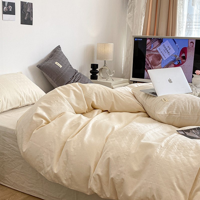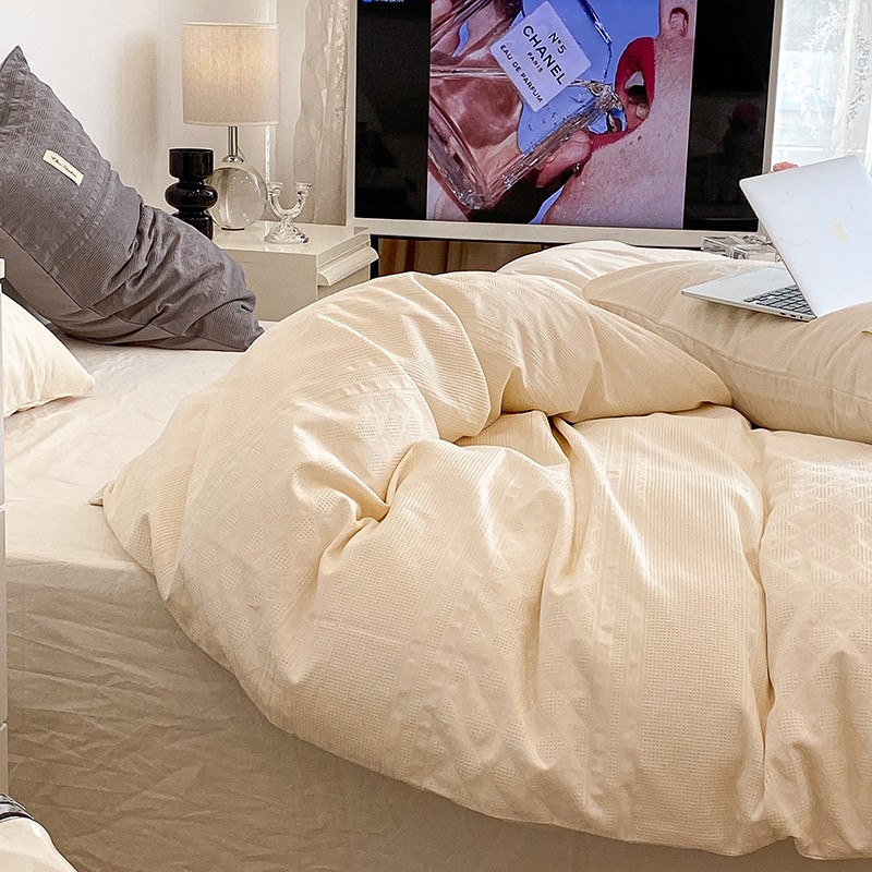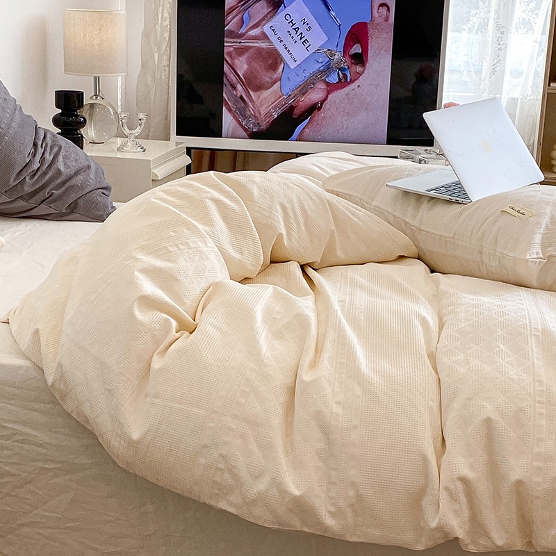 昔可 2022新款60支水洗棉华夫格提花四件套拍法一 四花格米白