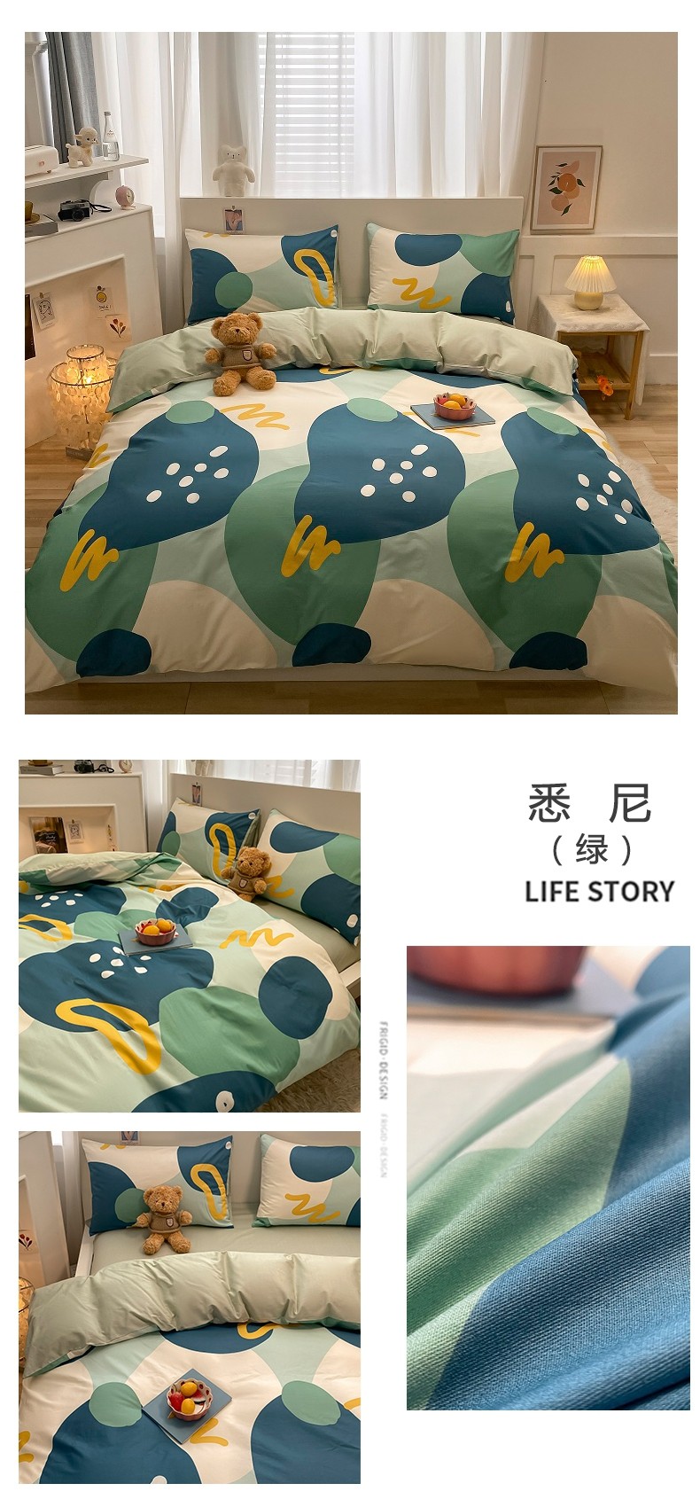 (总)吉象 2022新款全棉活性印花四件套-北欧风系列,马里奥,悉尼-豆沙,悉尼-绿