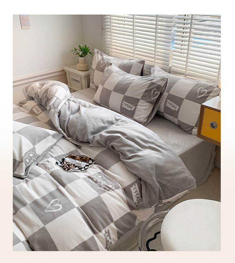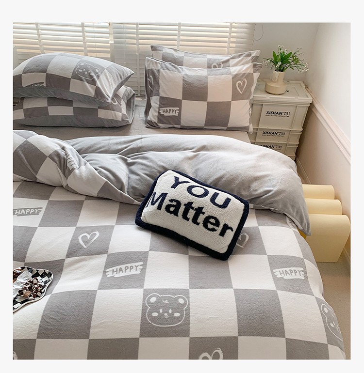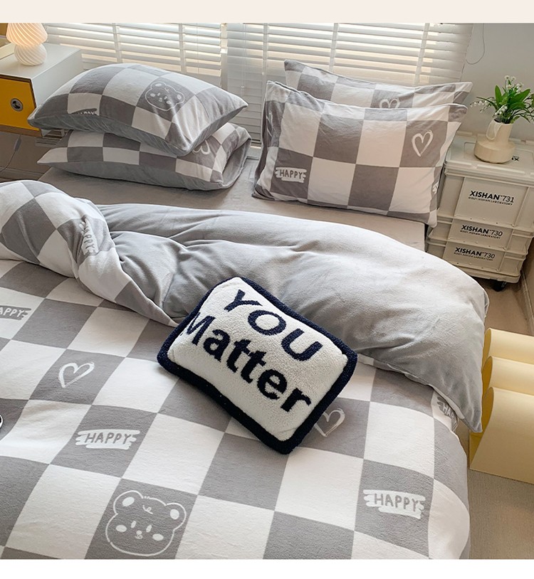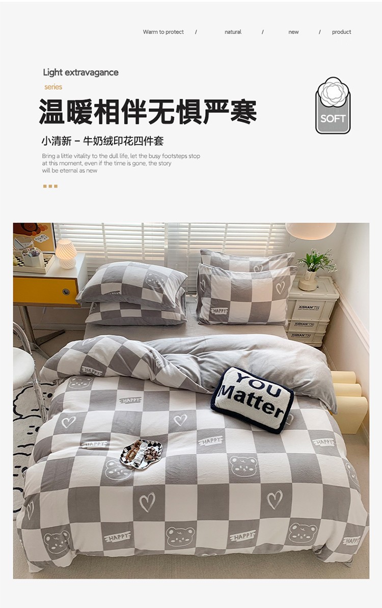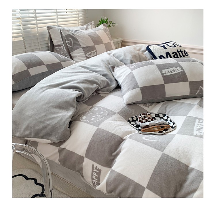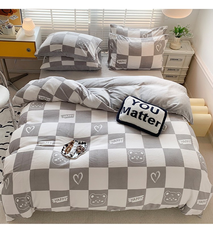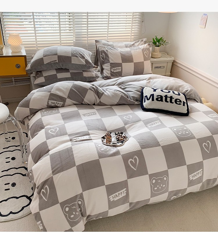 澳萝拉 2022新款牛奶绒印花四件套 棋盘格熊