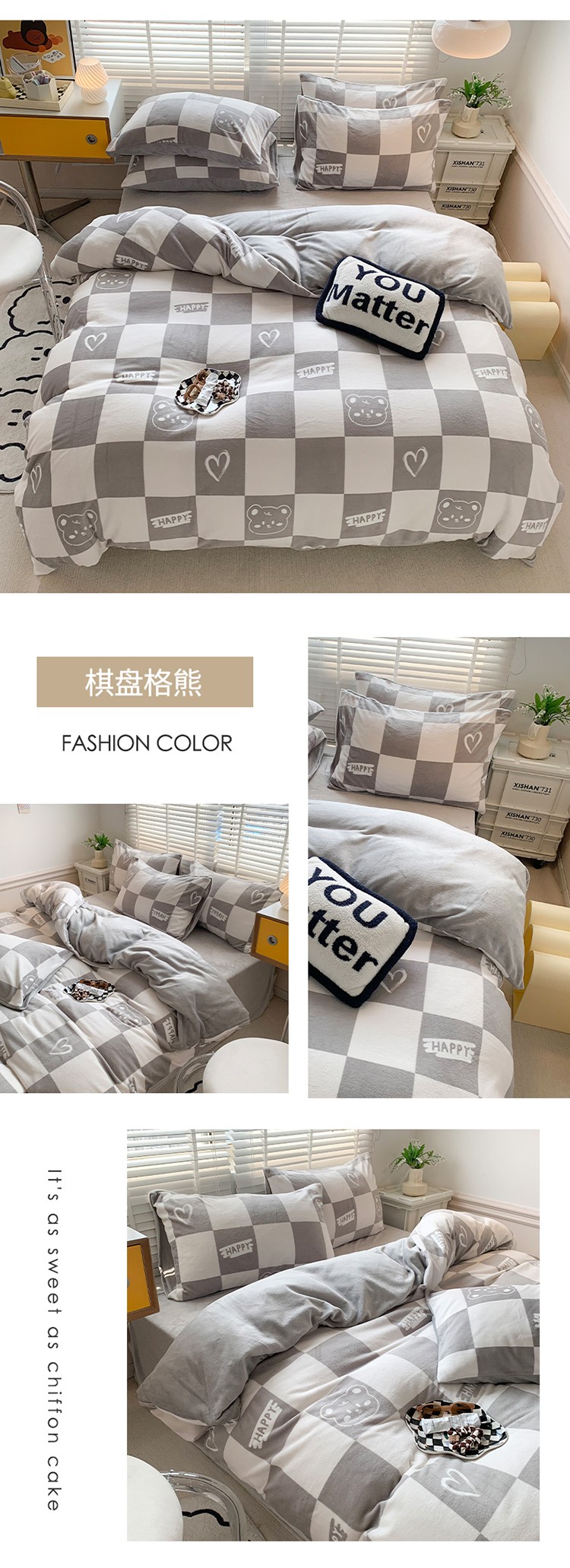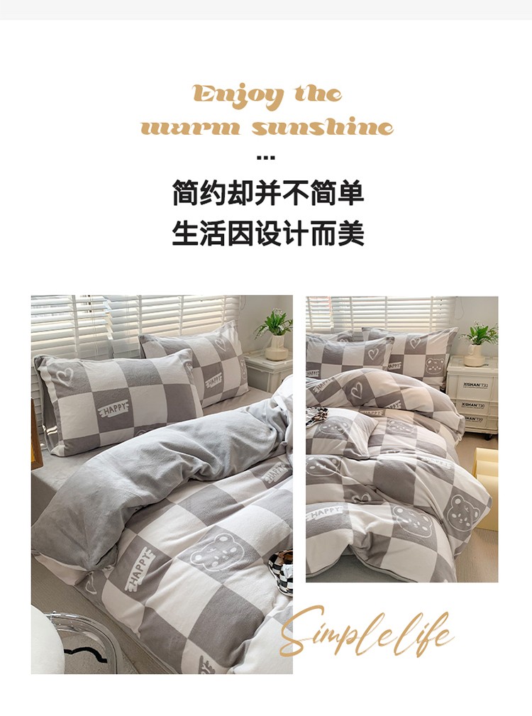 商品名称:澳萝拉 2022新款牛奶绒印花四件套 棋盘格熊