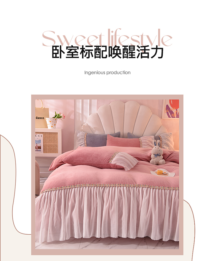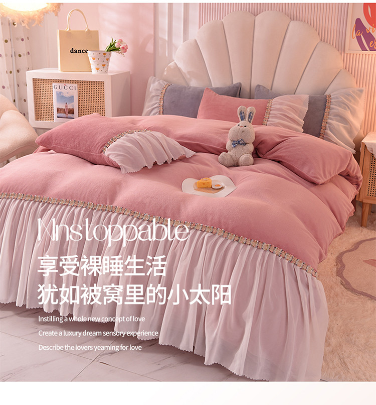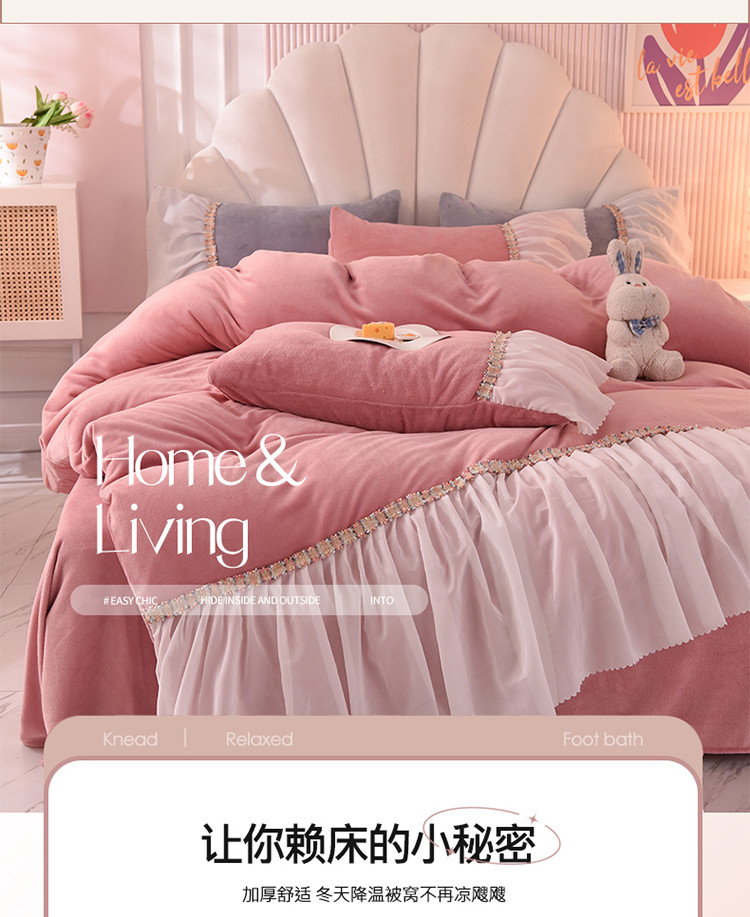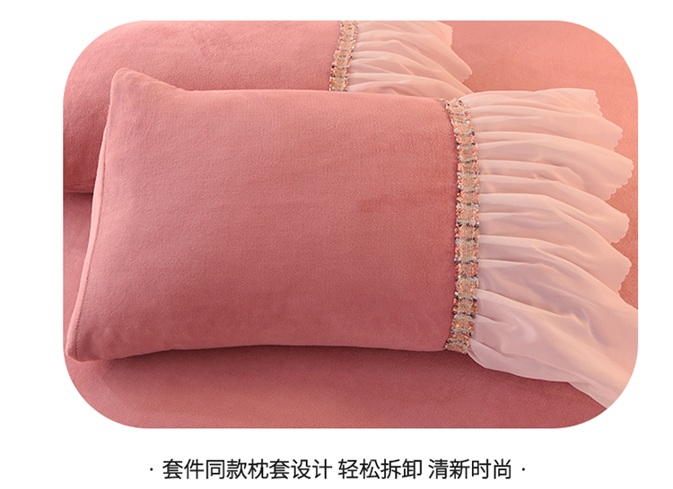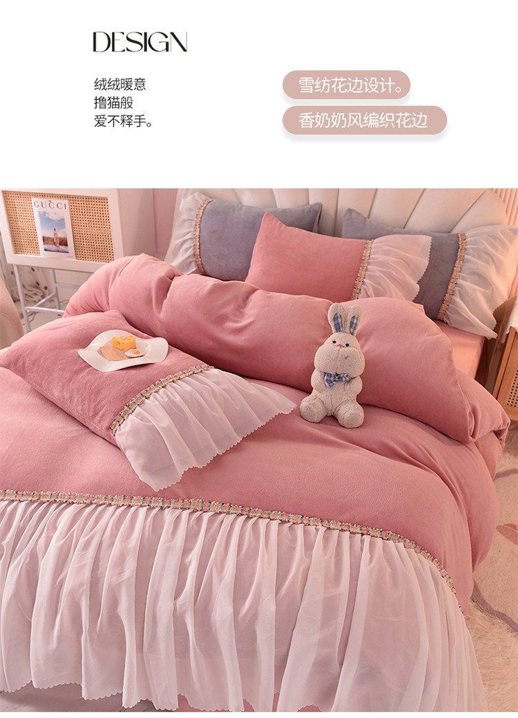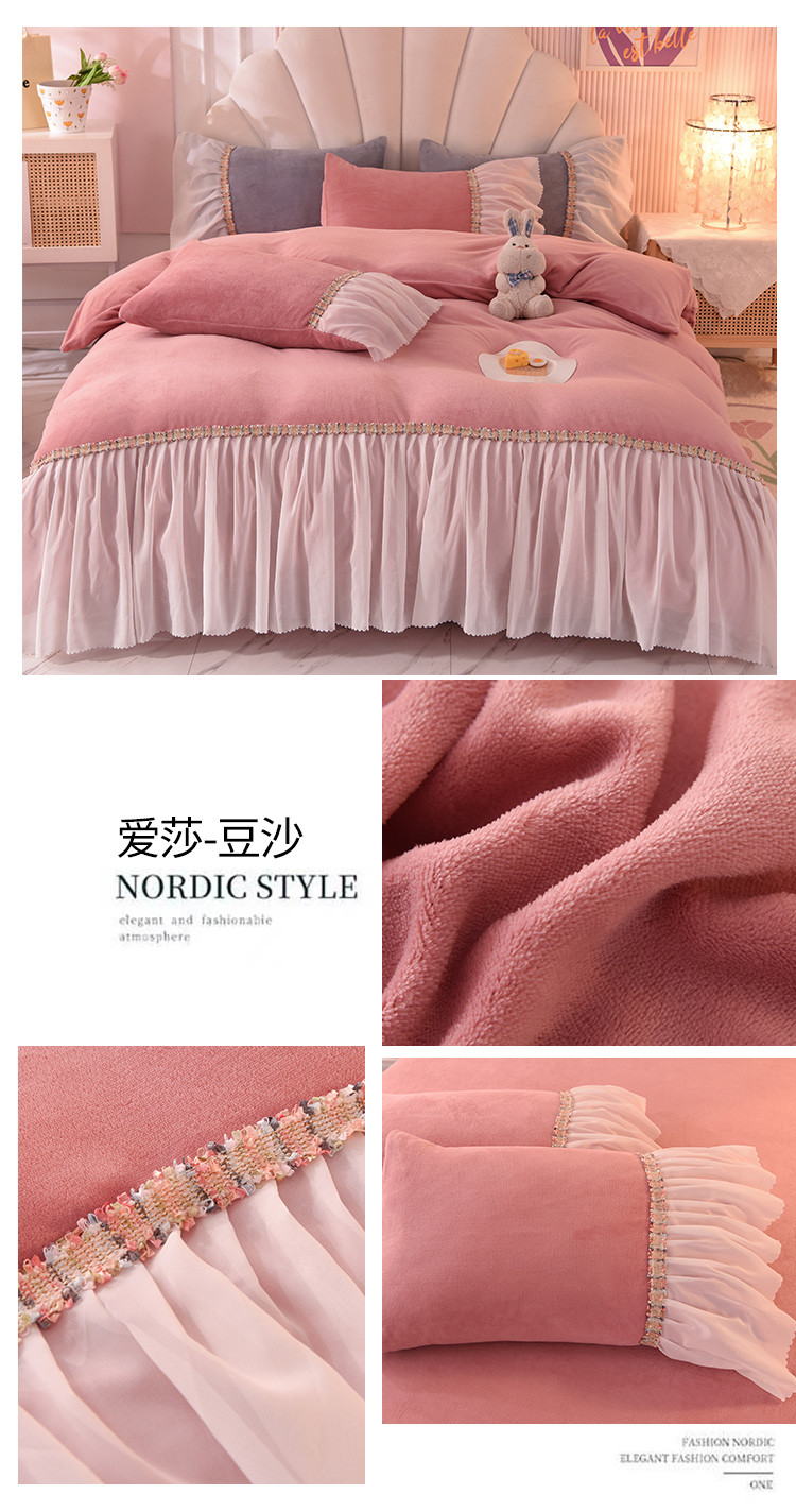 当前位置: 91家纺网 > 商品网购 > 床品套件 > 四件套 > 牛奶绒四件套 > 艾米家居 2022秋冬新款牛奶绒花边四件套爱莎系列 豆沙