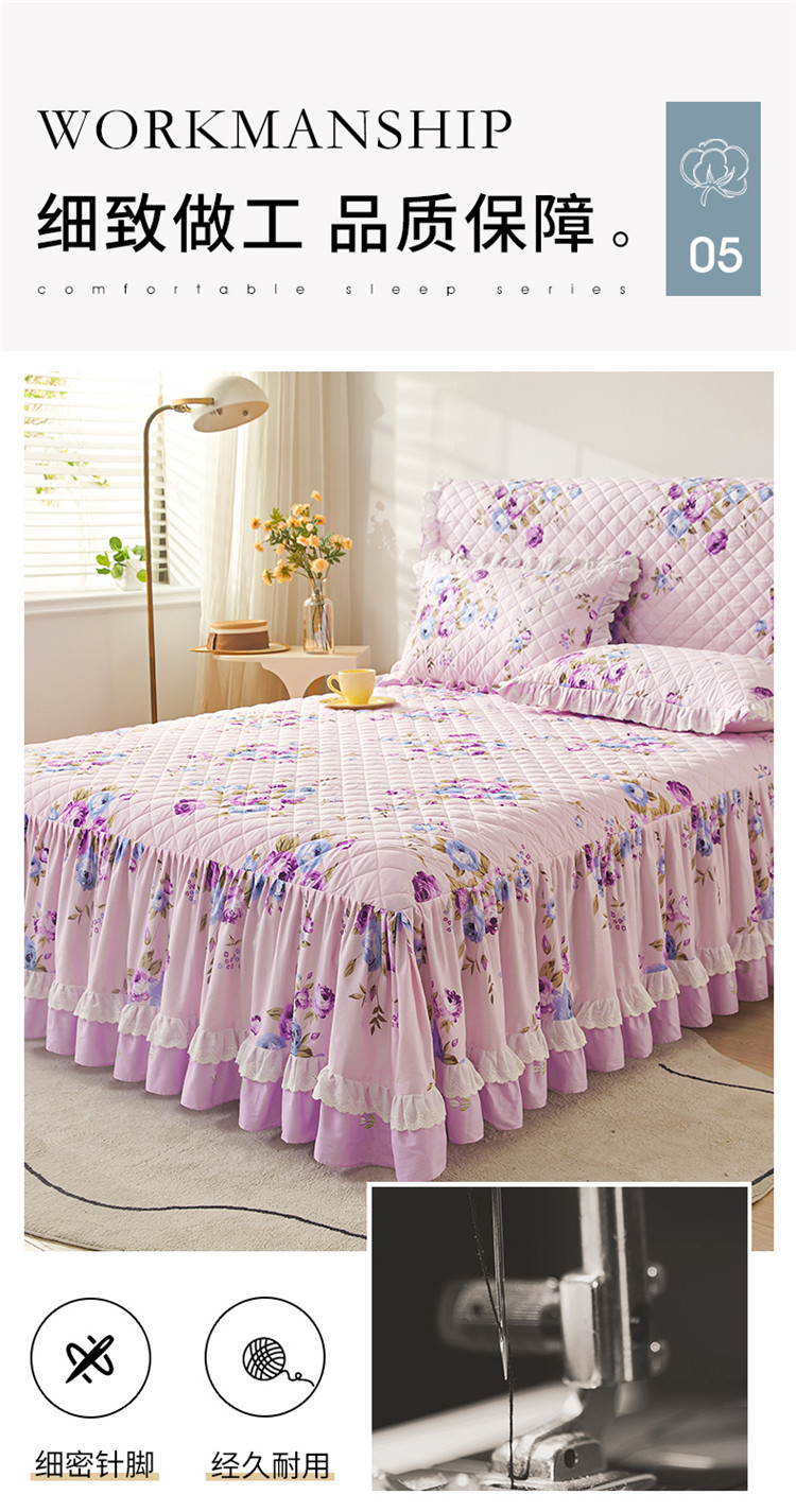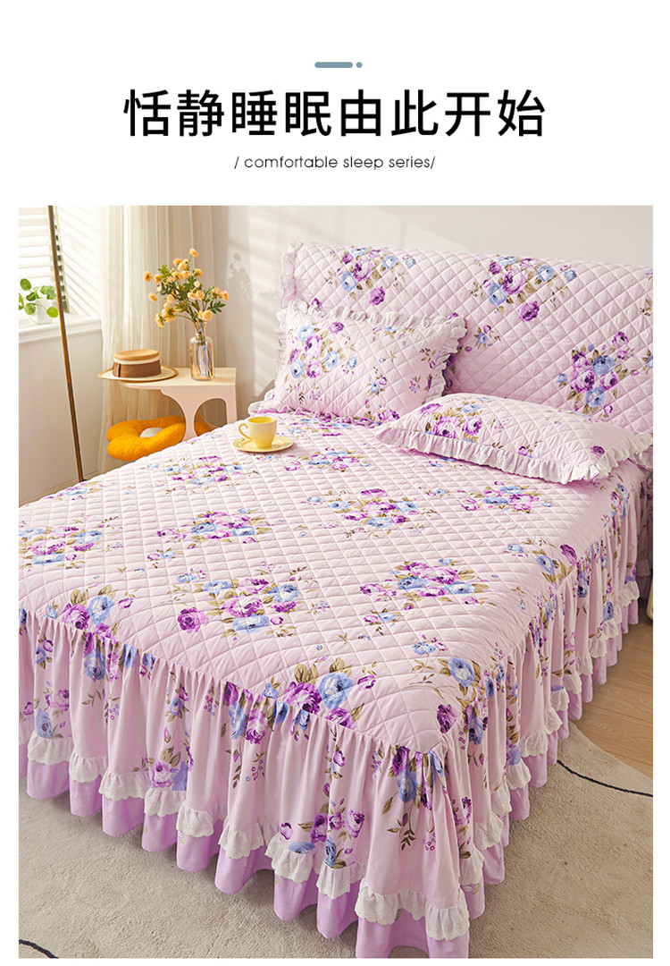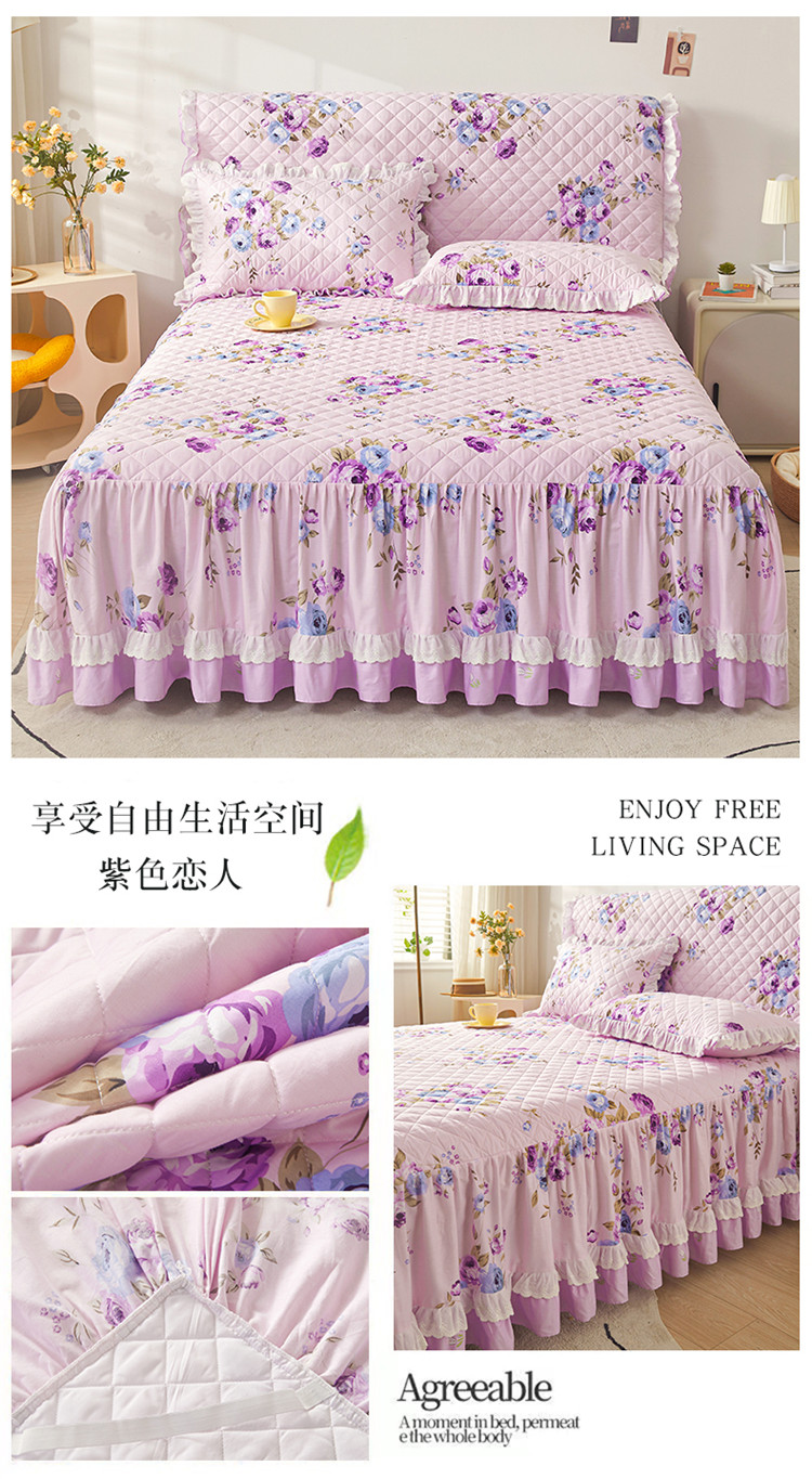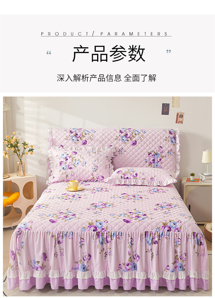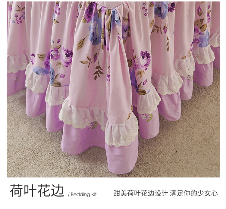 十个点 2024新款全棉印花夹棉韩版蕾丝床裙三件套 紫色恋人-夹棉
