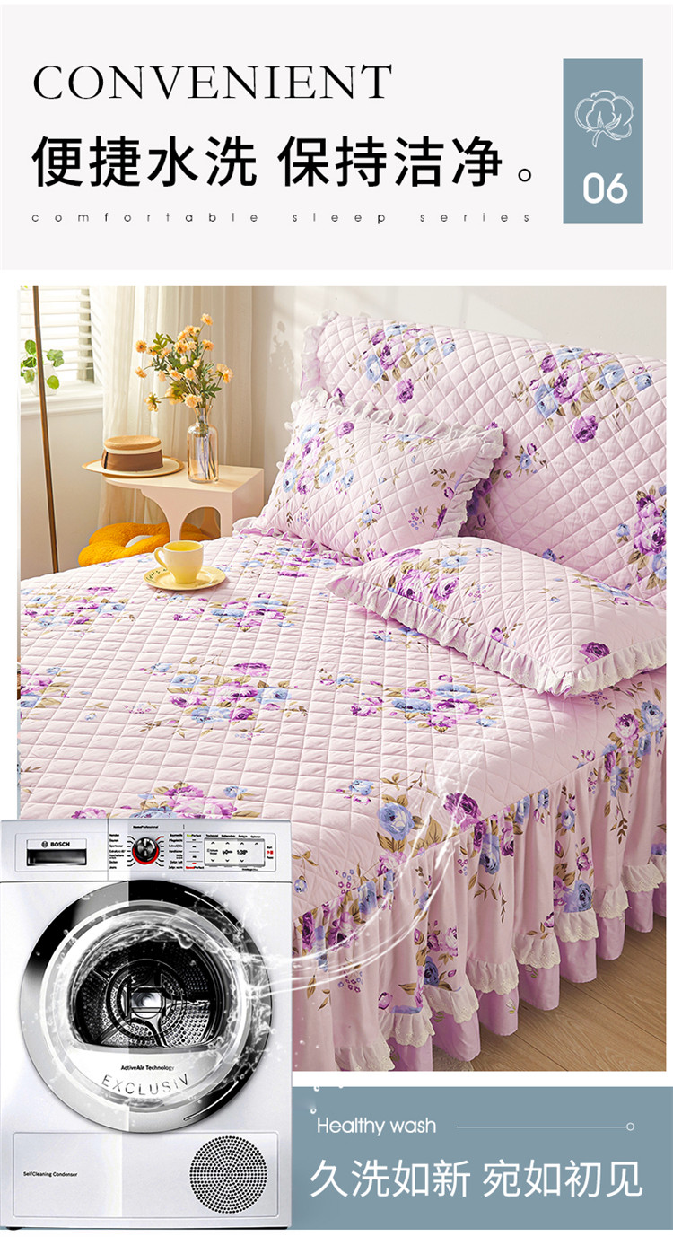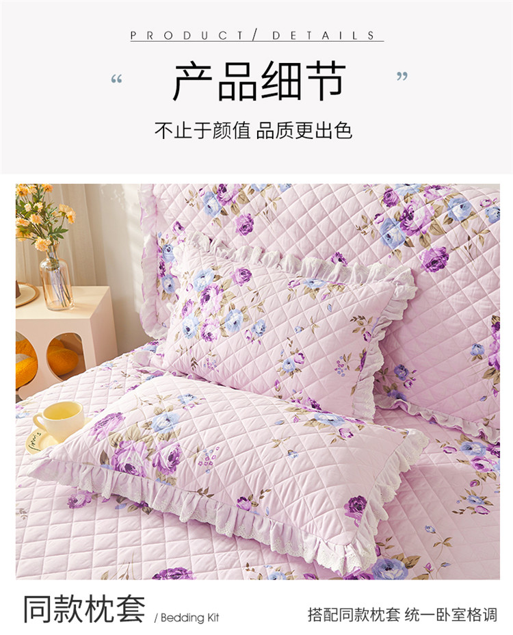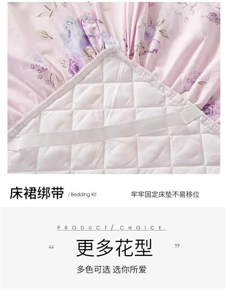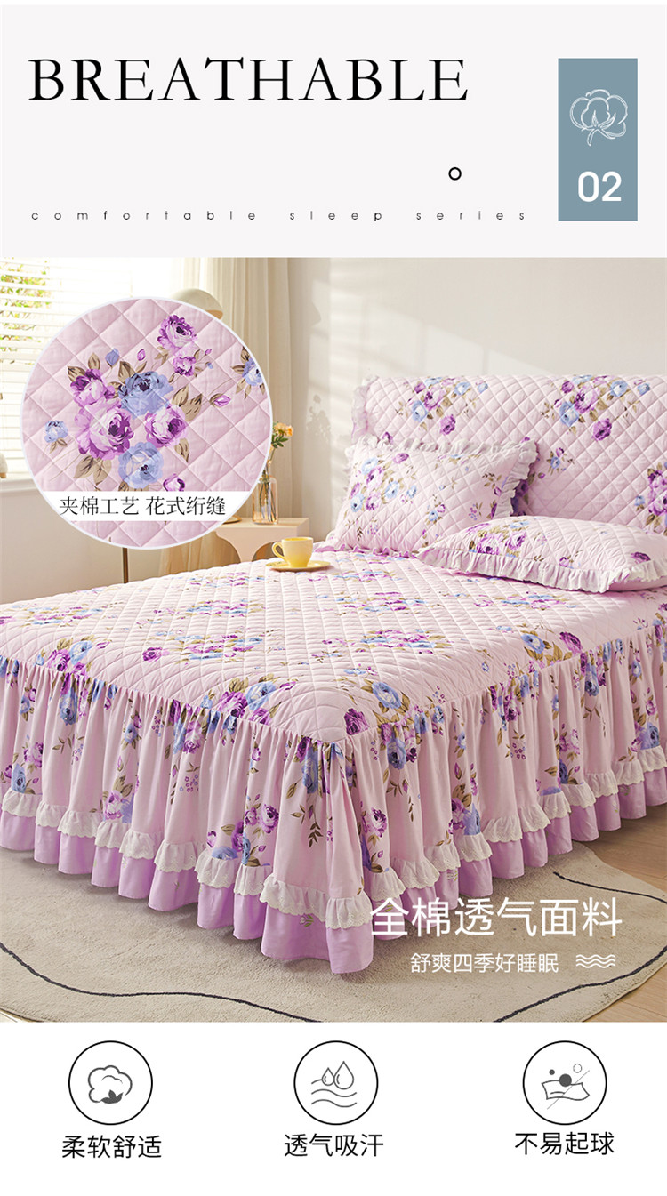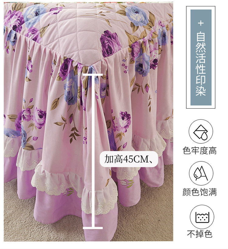 十个点 2024新款全棉印花夹棉韩版蕾丝床裙三件套 紫色恋人-夹棉