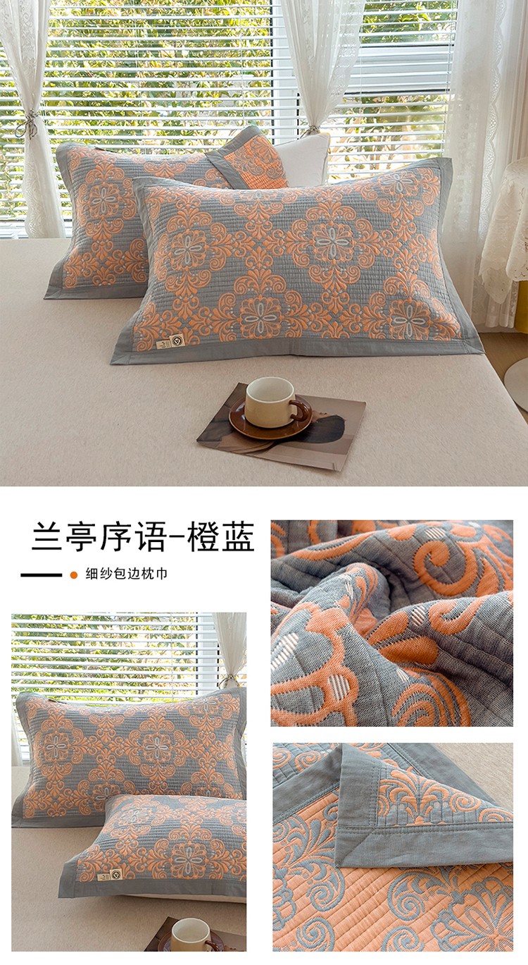 商品名称:棠薇 2023新款全棉三层细纱色织提花枕巾夏天枕头巾 兰亭序语-橙蓝
